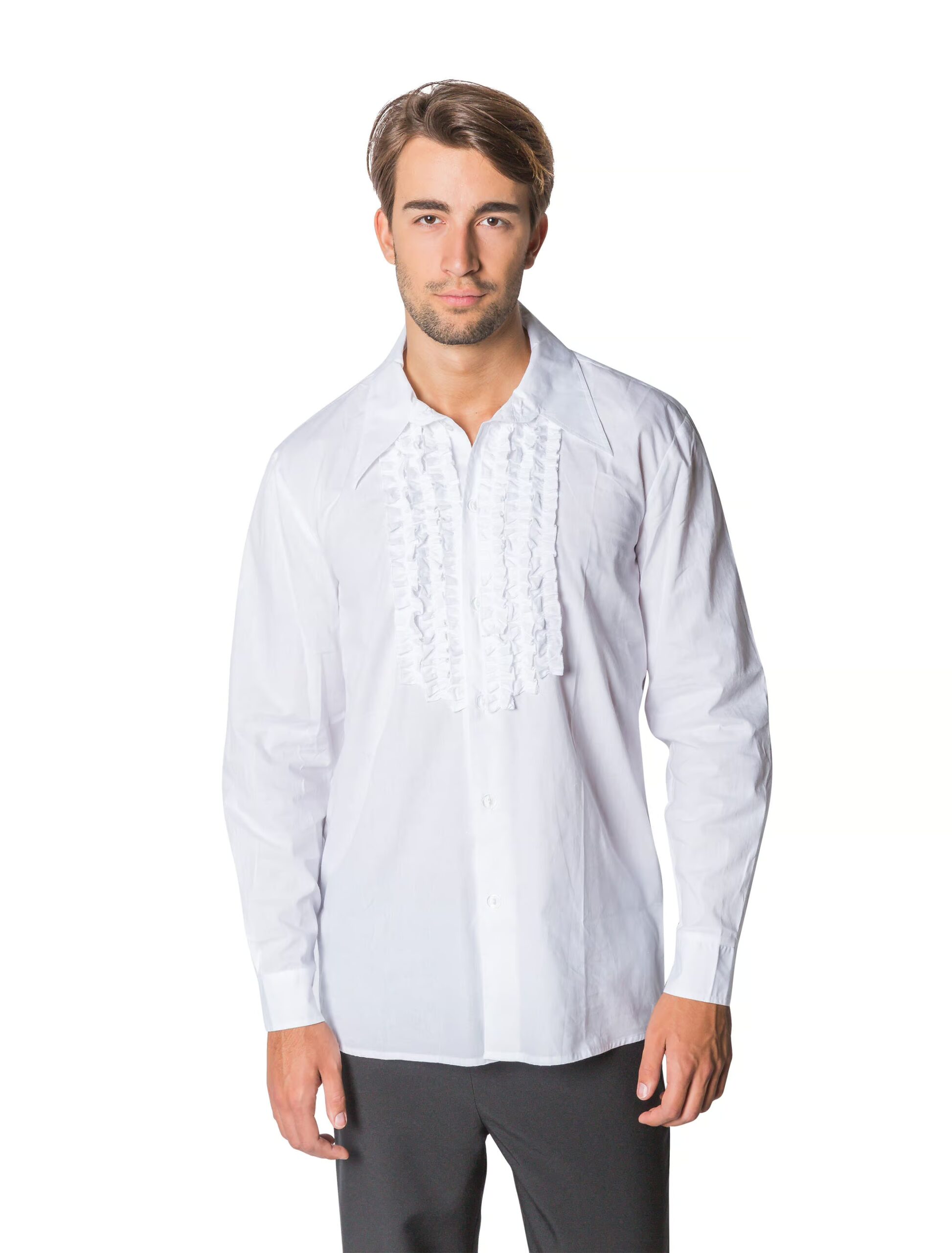 Dieses Hemd ist ein wahres Kombinationswunder! Durch die neutrale Farbe in Weiß und den schicken Baumwoll-Stoff ist das Rüschenhemd für Herren vielseitig einsetzbar. Ob zu einem schlichten Anzug, einem auffälligen Kostüm oder einfach als stylisches Hemd auf Deiner Party – Du bist garantiert perfekt gekleidet und optisch ein Hingucker! Das Hemd in Baumwolle ist mit verspielten Rüschen entlang der Knopfleiste verziert. Es ist locker und lang geschnitten und mit langen Ärmeln ausgestattet, die in Manschetten mit Knöpfen enden. Das Hemd ist schlicht und doch ein optisches Highlight und lässt sich zu nahezu allen Farbkombinationen einsetzen. Ein echter Kostüm-Allrounder für Deine Karnevals- oder Mottoparty!