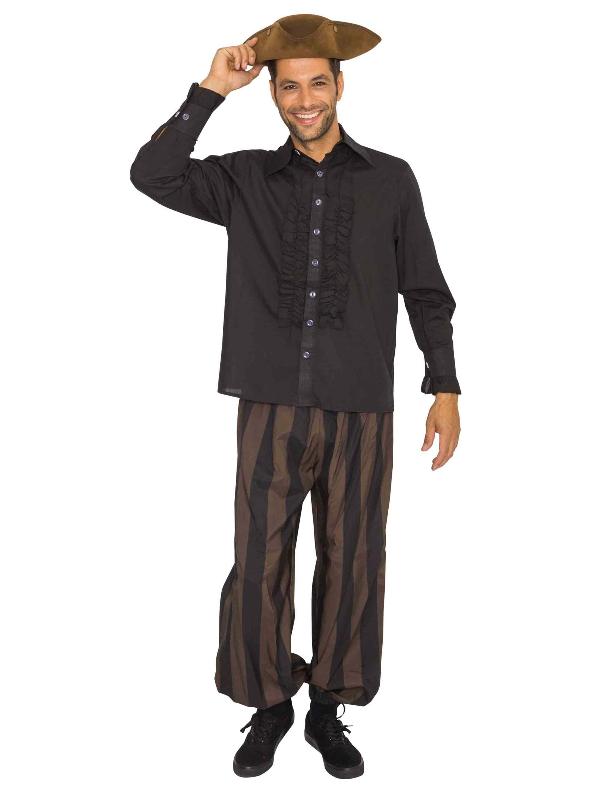 Das Rüschenhemd – der Klassiker unter den Hemden! Dieses schicke Herren Hemd besteht aus einem schwarzen Stoff, der sich in der Front durch eine Knopfleiste schließen lässt. Die farbigen Knöpfe bilden einen schönen Kontrast zum dunklen Hemd, tragen aber dennoch nicht auf. Auch die eng verlaufenen Ärmelsäume sind mit Knöpfen verziert. Hingucker sind die schönen Rüschen, die das Hemd links und rechts von der Knopfleiste zieren. Passend dazu sind auch die Ärmelsäume mit Rüschen verziert. Der auffällige Stehkragen rundet das schicke Rüschenhemd perfekt ab. Ob als Basic für ein 70er- oder 80er-Jahre Kostüm oder als besonderer Hingucker für ein Western Outfit, in diesem romantischen Rüschenhemd für Herren stiehlst Du auf der kommenden Party jedem die Show!
