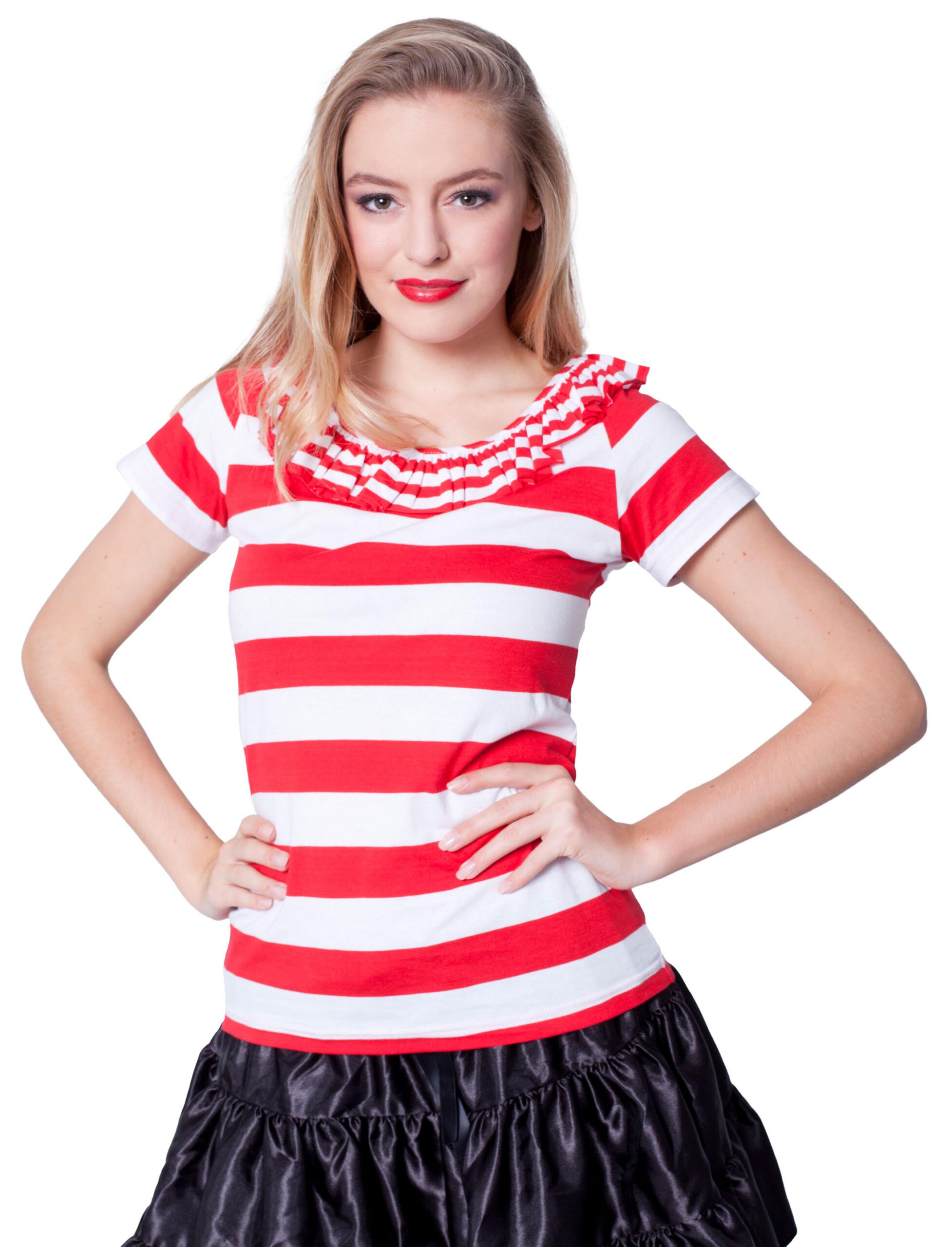 Für eine Dame darf es gerne etwas Rüschiges sein. Der ausgefallene Kragen wirkt verspielt und mädchenhaft. Als Piratenbraut oder lustiger Clown, dieses rot/weiß geringelte Shirt ist vielseitig einsetzbar. Doch das Oberteil passt nicht nur in die Karnevalszeit, sondern ist auch darüber hinaus gut tragbar. Das Shirt besteht aus 100% reiner Baumwolle.