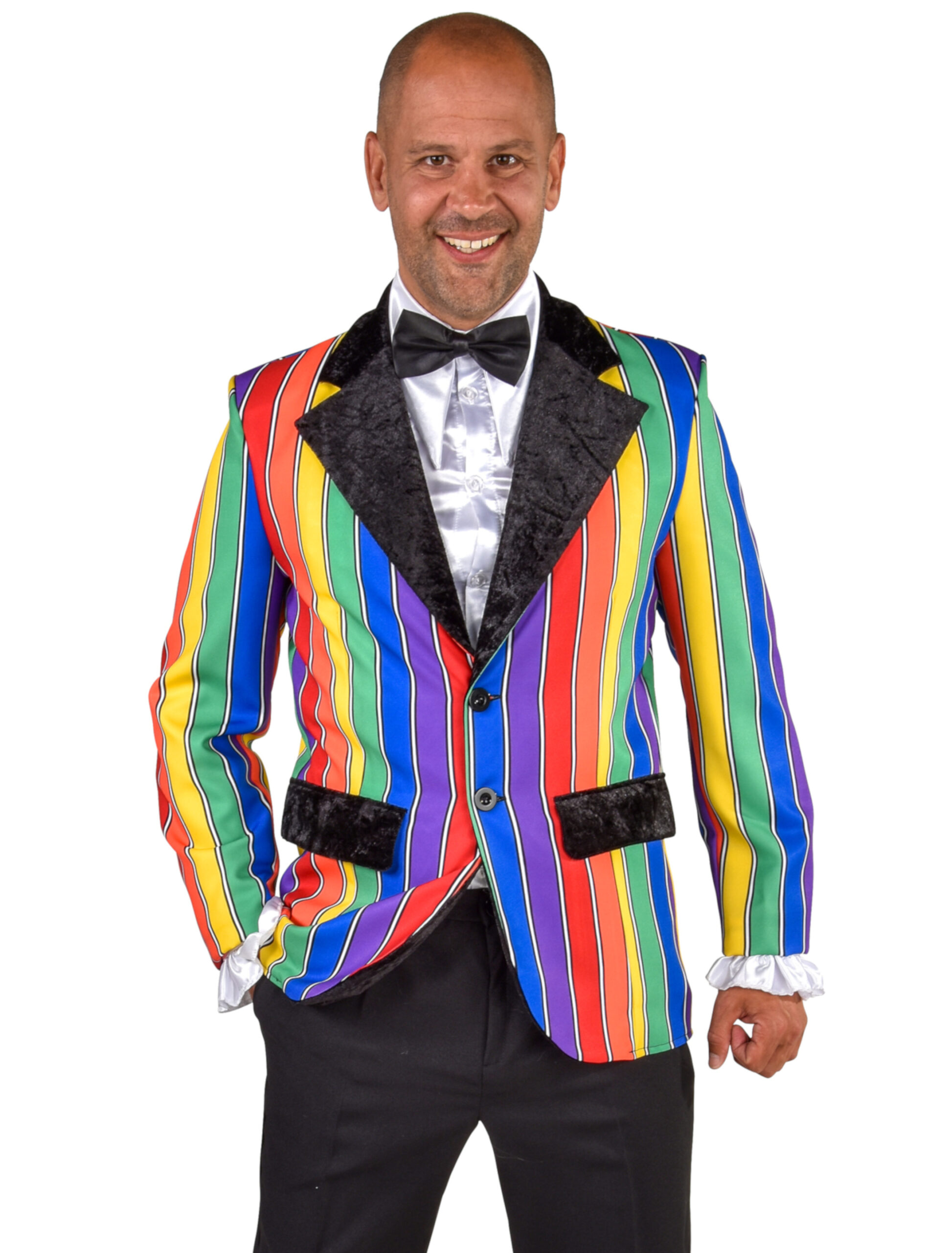 Auffällig und doch elegant ist dieses bunte Herrensakko, mit dem Du zum Karneval und auf Motto-(Regenbogen)Partys bei den Damen Punkte sammeln kannst. Es macht aus Dir einen interessanten und selbstbewussten Mann, der es versteht das Leben in vollen Zügen zu genießen. Das längsgestreifte, farbige Sakko bekommt durch die kontrastfarbenen schwarzen Reverse eine besonders charmante Note. Kombiniere es mit den passenden Kostümteilen aus unserem Shop und werde zum extrovertierten Lebemann.