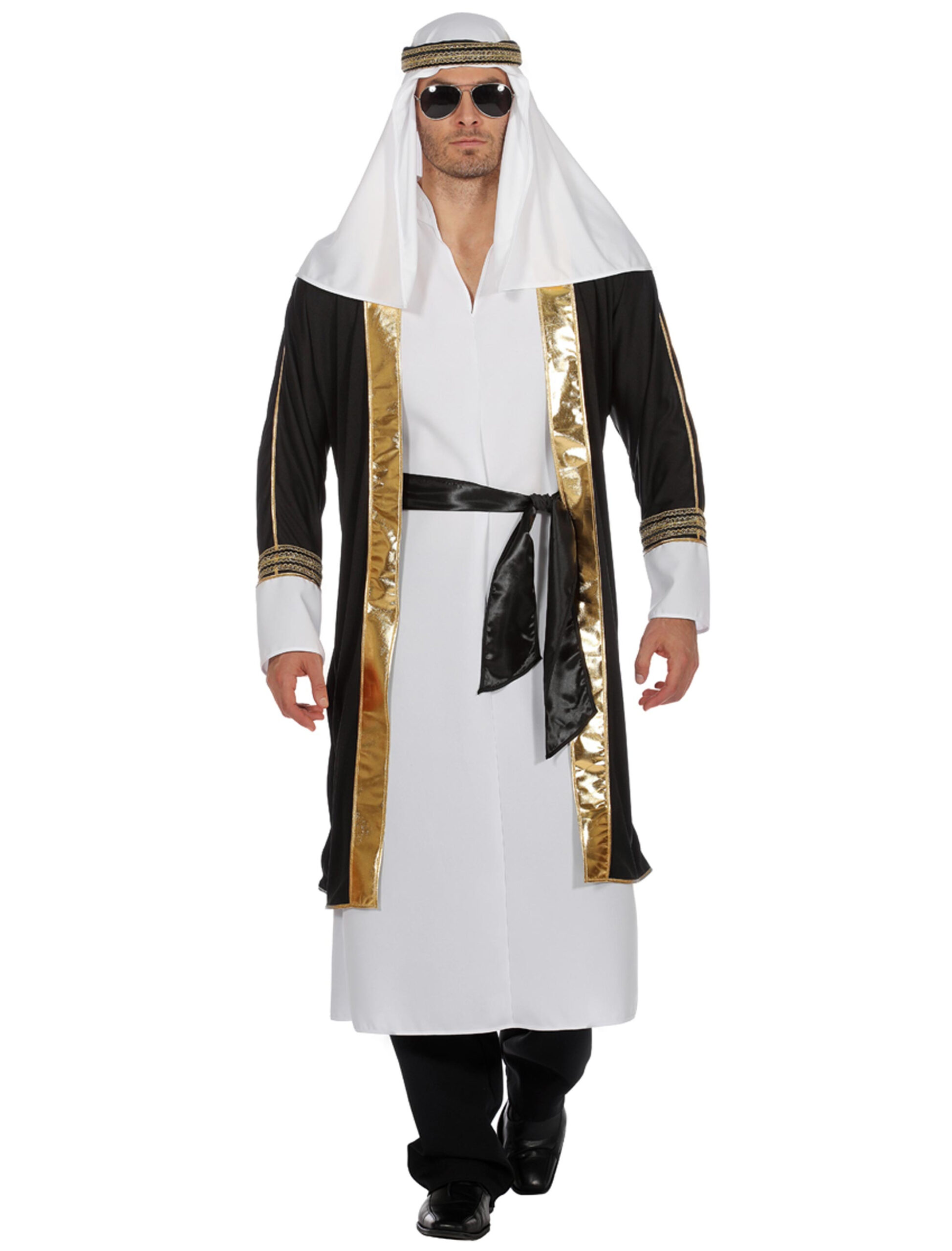 Gleich fünf unterschiedliche Teile beinhaltet das Scheich Kostüm für Herren. Bestehend aus Gewand, Gürtel, Jacke, Kopftuch und Stirnband kannst Du Dich wie ein saudischer Prinz fühlen. Mit der passenden Sonnenbrille in der Farbe Schwarz kannst Du beim Feiern richtig abgehen und den anderen Partygästen von Deinen Besitztümern berichten. In mehreren Größen ist das arabische Outfit bei uns verfügbar und eignet sich auch ideal für Mottopartys. Beim Feiern kannst Du mit der Karawane von Club zu Club ziehen.