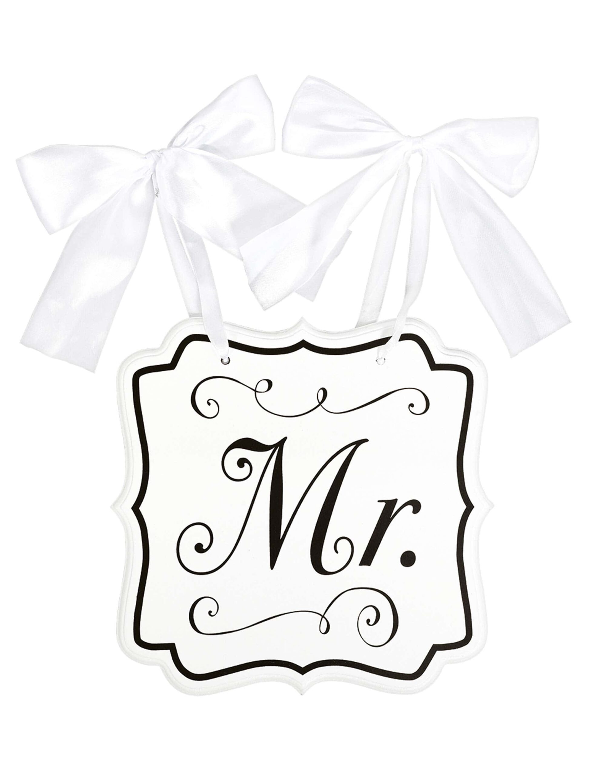 Das weiße Holz-Schild mit der Aufschrift Mr. hat eine Größe von 23,8 x 24,7 cm. Es ist mit zwei Schleifen zum Aufhängen ausgestattet. Perfekt für die Hochzeit als Dekoration!
