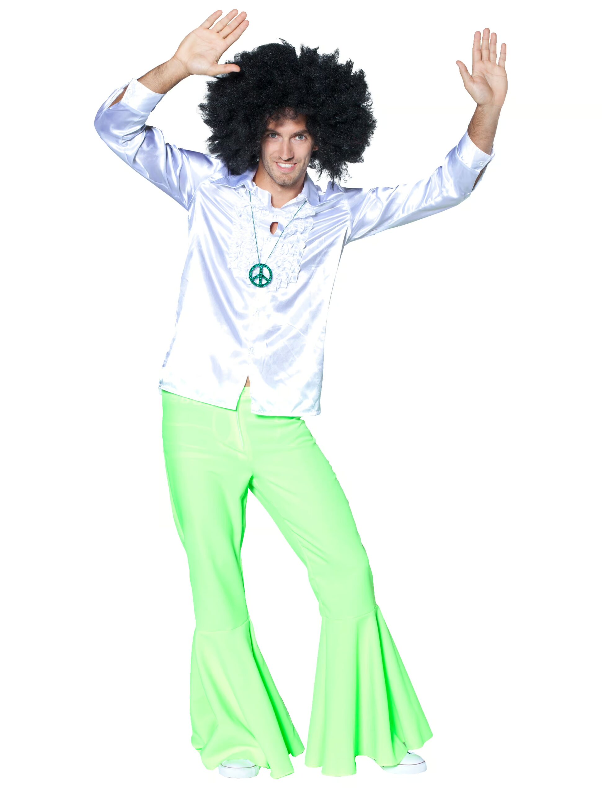 Bunter geht es nicht! Mit dieser Schlaghose in Neongrün bist Du das optische Highlight auf Deiner Karnevals- oder Mottoparty. Die Schlaghose garantiert über einen Gummibund bequemen Halt und passt sich so Deiner Figur ideal an. Die enge Hose wird im Wadenbereich zu einer weit ausgestellten und in Falten gelegten Schlaghose – ganz im Stil der 70er Jahre. Kombiniere die bunte Hose zu auffälligen Oberteilen und Accessoires und style Dich wie es Dir beliebt – ob als Hippie oder Schlagerstar, die Hose ist ein Kombinationswunder! Mit dieser Schlaghose für Herren versetzt Du Dich auf Deiner Party zurück in die wilden 60er und 70er Jahre!