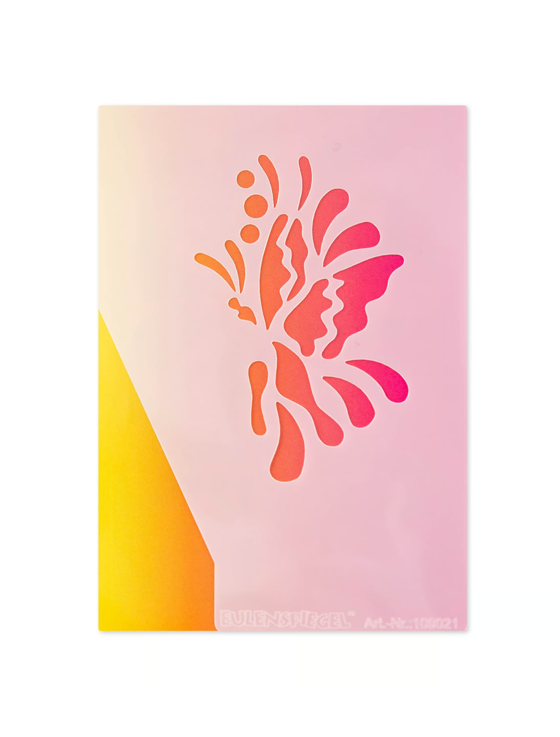 Du willst dich in einen zauberhaften Schmetterling verwandeln, aber freihändig malen ist nicht dein Ding? Kein Problem! Mit unserer Schminkschablone zauberst du ganz schnell einen Schmetterling in dein Gesicht. Einfach auflegen, Farbe drauf – und schon flatterst du mit einem traumhaften Look über jede Party! Ob für Karneval, Mottopartys oder einfach, um ein bisschen Magie in den Alltag zu bringen – mit diesem Muster setzt du dich garantiert in Szene. Egal ob bunt oder elegant in Silber und Gold – mit dieser Schablone gelingt dein Look im Handumdrehen. Also, schnapp dir die Schminke und lass dein Gesicht erstrahlen!