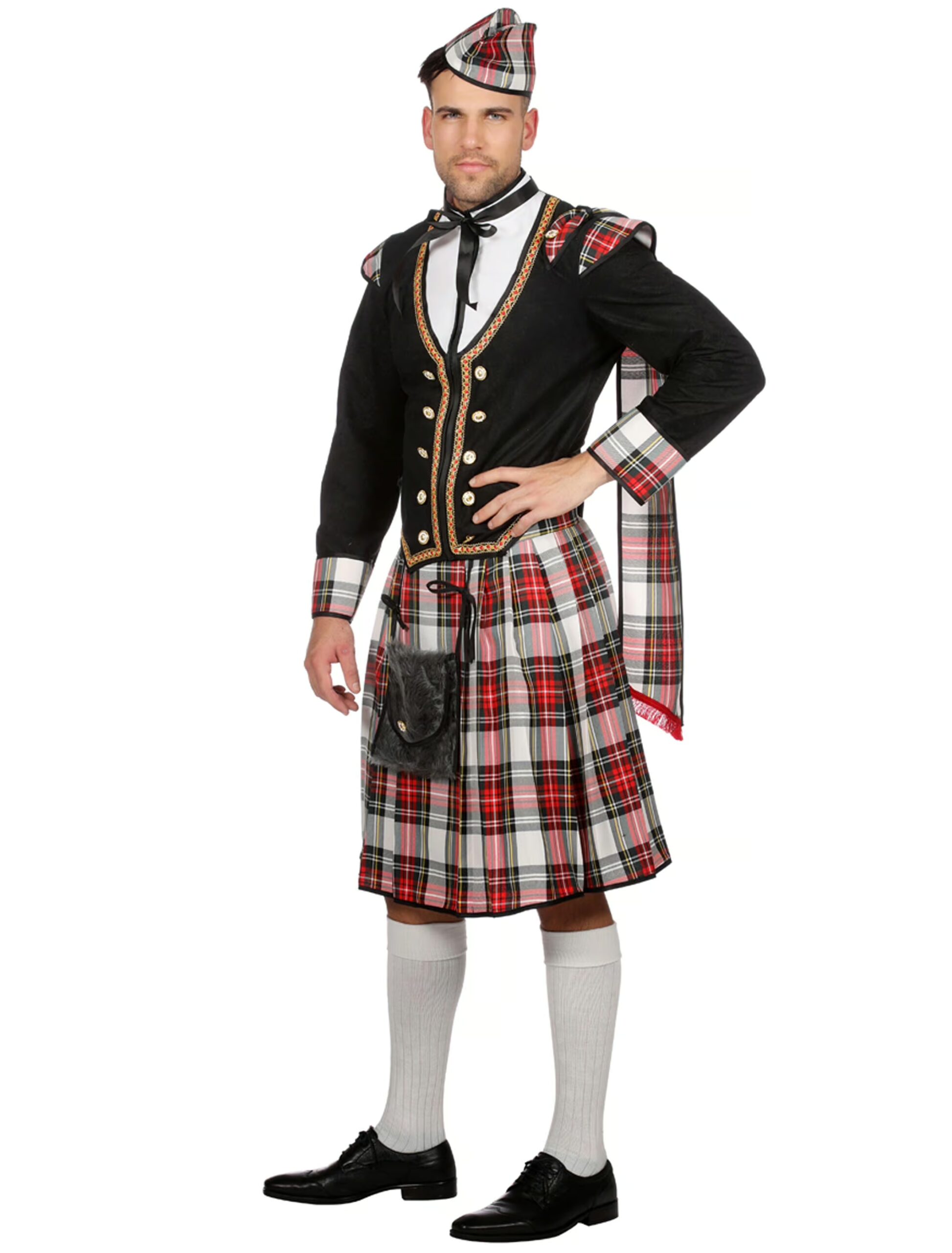 Mit diesem Kostüm wirst Du auf der nächsten Motto-Party oder beim Karneval als echter Schotte auftrumpfen können. Es kombiniert die wichtigsten Teile eines traditionellen schottischen Auftretens. Eine dunkle Jacke mit einigen Verzierungen gehört ebenso dazu, wie das typische schottische Kleidungsstück schlechthin. Natürlich ist die Rede vom Kilt. Der Schottenrock ist genau wie der beinhaltete Hut rot kariert. Das Set fügt sich so zu einer guten Grundlage für eine beliebige Erweiterung des Kostüms zusammen. Dabei wurden alle Bestandteile des dreiteiligen Outfits vollständig aus Polyester gefertigt.