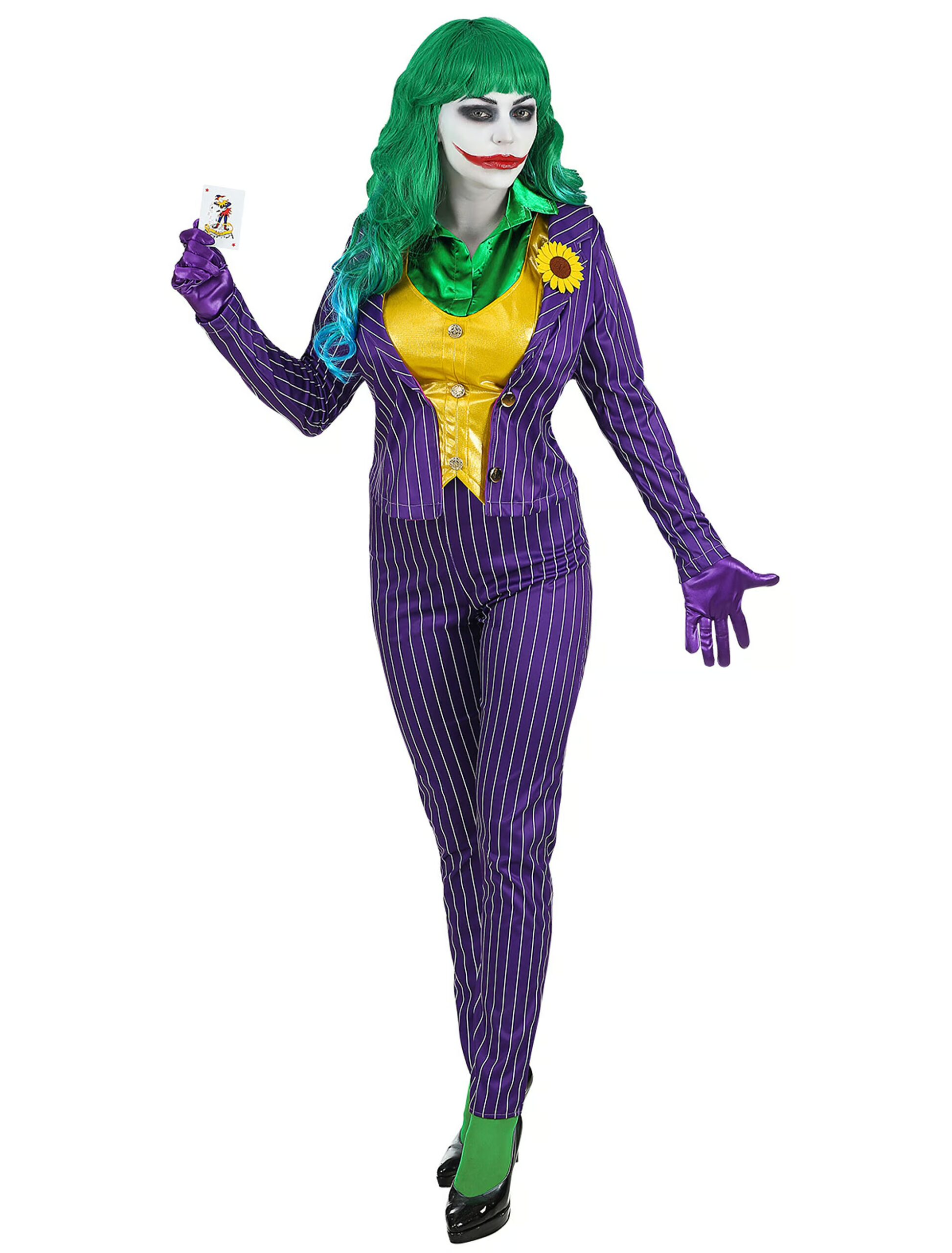 Du willst einmal in die Rolle eines bösen Mädchens schlüpfen? Dann hole Dir jetzt unser Schurkin Outfit im angesagten Lila Design! Das mehrteilige Set, bestehend aus Jacke mit angenähter Bluse und Weste, Hose und Handschuhen liefert Dir die passenden Basics, um das Nachtleben unsicher zu machen. Der gestreifte Look wirkt sehr elegant und kann mit einer grünen Perücke und grünen Socken perfekt kombiniert werden. Natürlich darf bei diesem Outfit die freche rote Fratze nicht fehlen, mit der Du die Cops einschüchtern kannst. Der körperbetonte Anzug sorgt dafür, dass sich andere männliche Schurken auf der Party auf Deine Seite schlagen. So hat das Gesetz keine Chance!