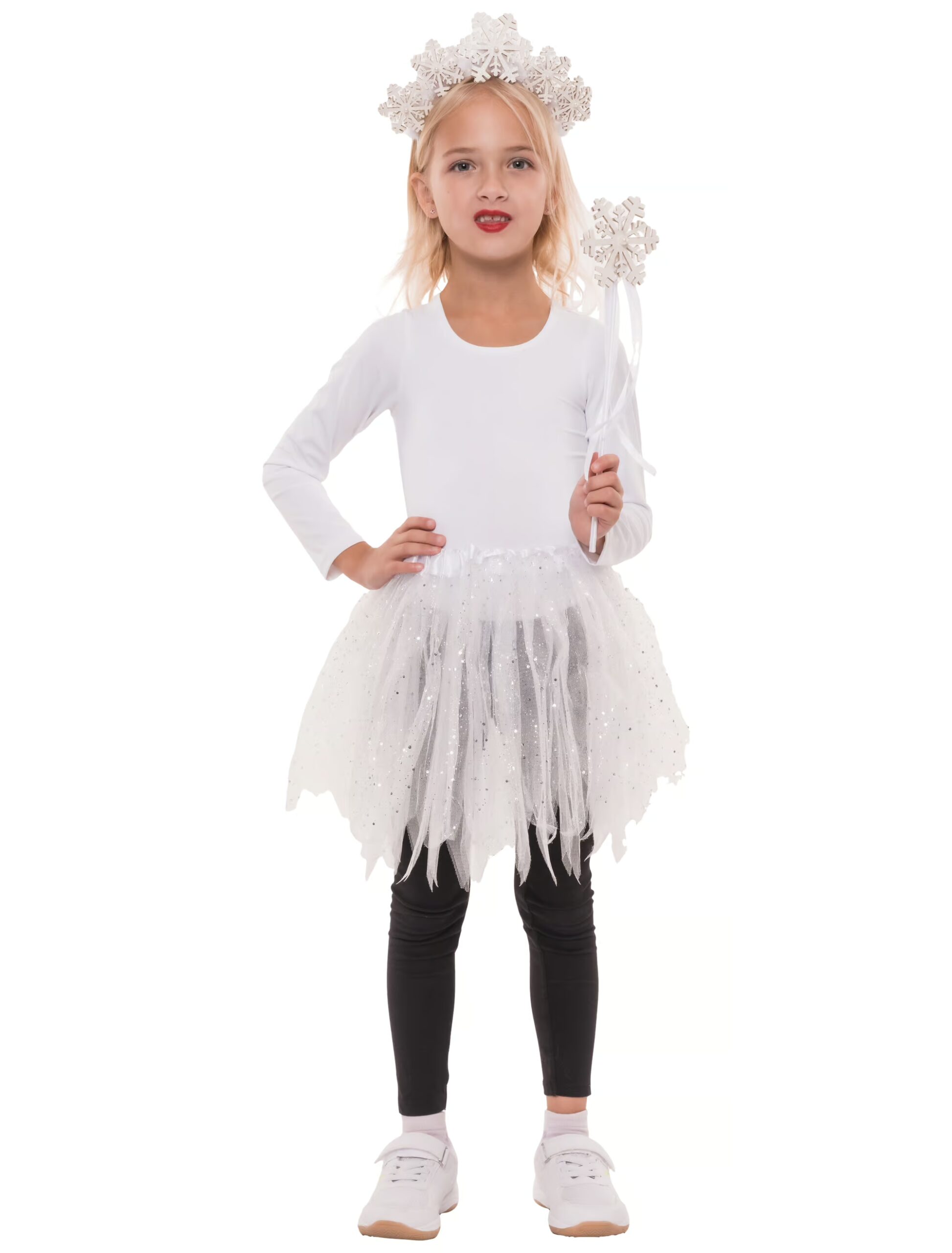 Mit unserem Set werden kleine Winterfeen und Schneeköniginnen zum funkelnden Highlight jeder Feier. Der zarte Tüllrock mit elastischem Bund ist übersät mit metallischen Punkten, die wie glitzernde Schneeflocken aussehen. Der Haarreif ist liebevoll mit kleinen Bommeln und großen Schneeflocken geschmückt und setzt ein magisches Statement. Der dazugehörige Stab krönt das Outfit: Oben prangt eine große Schneeflocke, von der vier schimmernde Bänder verspielt herabfallen. Perfekt für Karneval, Wintermärchen-Mottopartys oder einfach für zauberhafte Verkleidungsstunden zu Hause!
