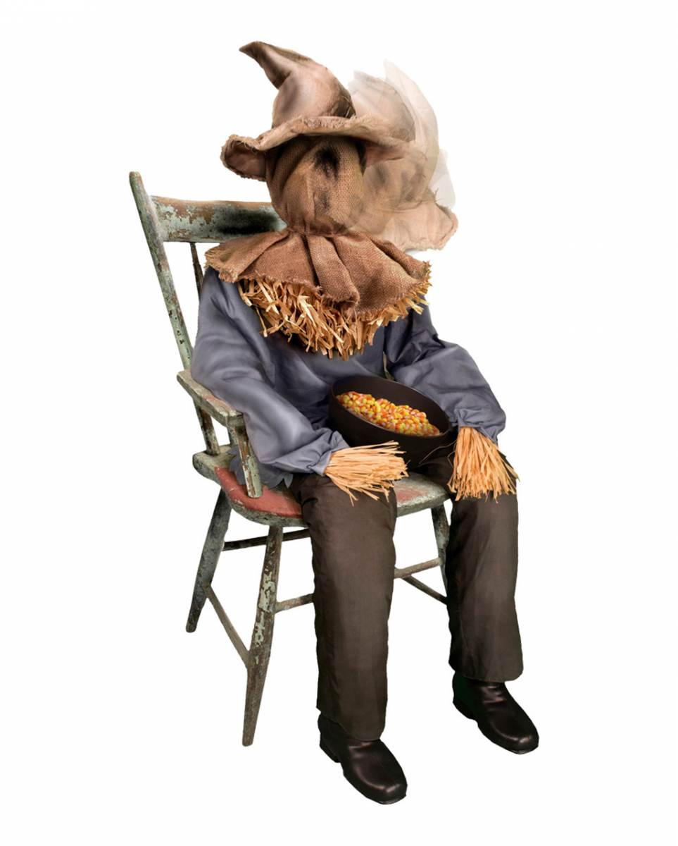 Halloween Vogelscheuche mit Schnappkopf und Gelächter Gruselige Scarecrow-Animatronic mit Sound und Bewegung Für Dein nächstes Halloween soll es etwas besonderes sein? Du suchst einen richtigen Schocker, der Deine Gäste noch überraschen und erschrecken kann? Die sitzende Vogelscheuche mit Schnappkopf ist die Antwort auf Deine Suche. Augelöst durch Bewegungs- und Geräuschmelder schnappt der Kopf der Horror-Vogelscheuche nach oben, sobald jemand die Hand in die Süßigkeitenschüssel streckt. Dabei bricht die Grusel-Scarecrow in grausames Gelächter aus – um die Atmosphäre Deiner Halloween-Party musst Du Dir hiermit keine Sorgen machen. Scheinbar schlafende Vogelscheuche, die jeden Dieb bemerkt, der versucht in die Bonbonschüssel zu greifen. Diese weiß sich zu wehren und deine Partygäste erschrecken fürchterlich. Die sitzende Vogelscheuche mit Schnappkopf ist ca. 130cm groß und besteht aus Polyester und Kunststoff. Lieferumfang: 1 x Halloween Vogelscheuche mit Schnappkopf und Gelächter Farbe: Braun, Blau, Beige, Schwarz Größe: ca. 130 cm Material: Polyester, Kunststoff, Elektronik Batterie: benötigt 4 AA Batterien, nicht inkl Ausgelöst durch Bewegungs und Geräuschmelder Kopf der Vogelscheuche schnellt nach oben Grausames Gelächter und Spooky Geräusche ertönen Für 6 V Adapter, Fussmatte und externe Lautsprecher kompitabel Stuhl nicht im Lieferumfang enthalten Achtung: Es ist wichtig, dass der Halloween Animatronic frei stehend, vor dem Zugriff durch Partygäste geschützt, aufgestellt wird. Der Halloween Animatronic besitzt eine sensible Elektronik, die kaputt gehen kann, wenn z.B. verhindert wird, dass sich die Figur bewegen kann. Professionelle Halloween Animatronics sind grundsätzlich Dekorationsartikel zum Ansehen und nicht zum Anfassen! Der Halloween Animatronic ist eine Innendekoration und im Außenbereich nur zu verwenden, wenn dieser eine trockenhaltende Überdachung hat!