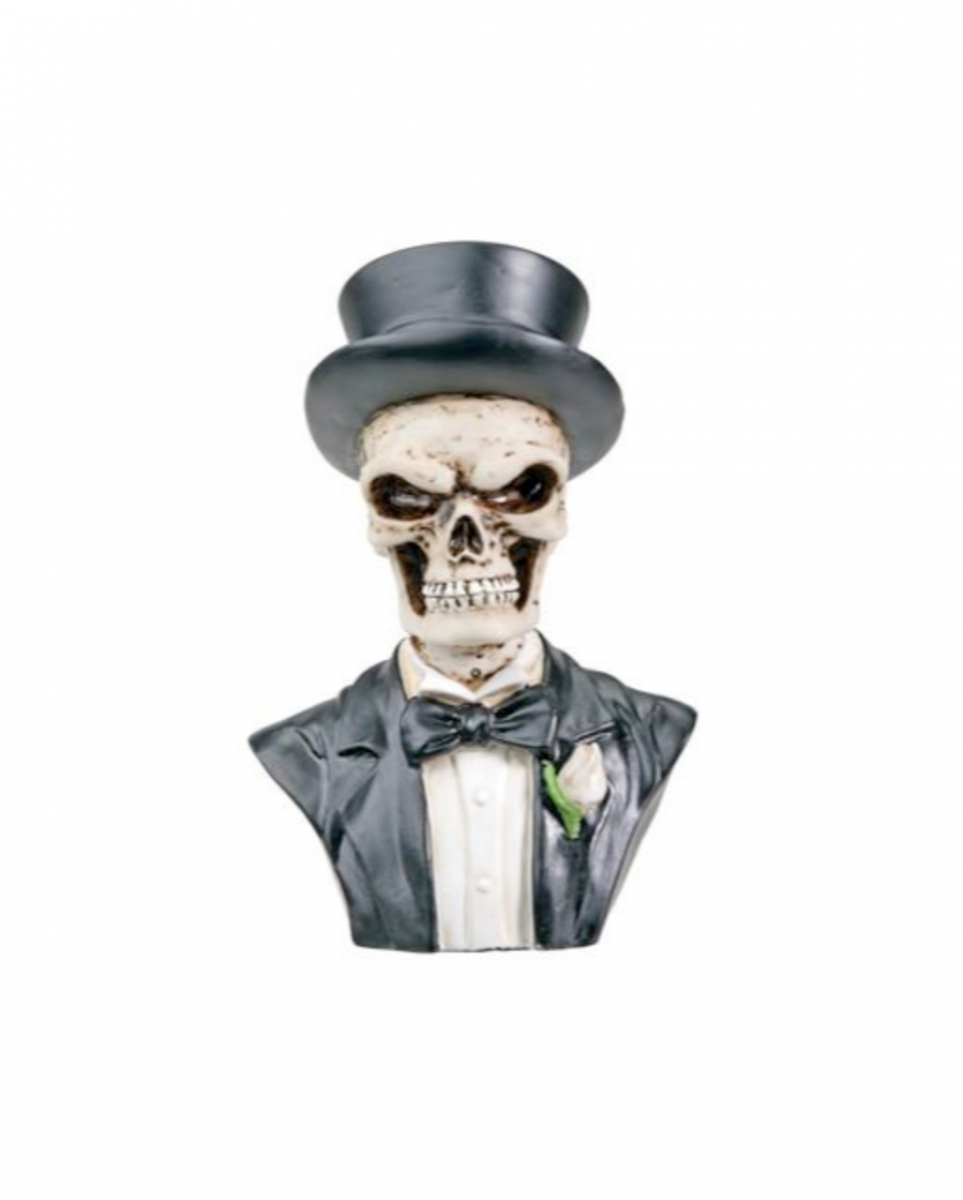 Skelett Bräutigam Büste als Dekofigur 11cm Bräutigam als morbide Gothic Büste Deine Gäste werden unseren schlecht gelaunten Skelett Bräutigam lieben! Die Skelett Büste passt super ins Grusel Buffet und macht sich auch hervorragend im Eingangsbereich. Die Skelett Bräutigam Büste als Dekofigur ist ca. 11 cm groß und trägt einen Zylinder mit Anzug. Sein Gesicht ist zu einer düsteren Fratze verzogen. Ob seine Liebste ihm vor dem Altar hat stehenlassen? Lieferumfang: 1 x Skelett Bräutigam Büste als Dekofigur 11cm Farbe: Schwarz, Weiß, Beige Material: Polyresin (Kunststein) Bräutigam als Skelett Dekoration Gothic Sammelfigur Polyresin Skelett Gentleman Büste Der Artikel ist ein Dekoartikel für Erwachsene und kein Spielzeug. Nicht für Kinder unter 3 Jahren geeignet. Kann Kleinteile enthalten, die verschluckt werden können – Erstickungsgefahr. Von Feuer und offenen Flammen fernhalten.