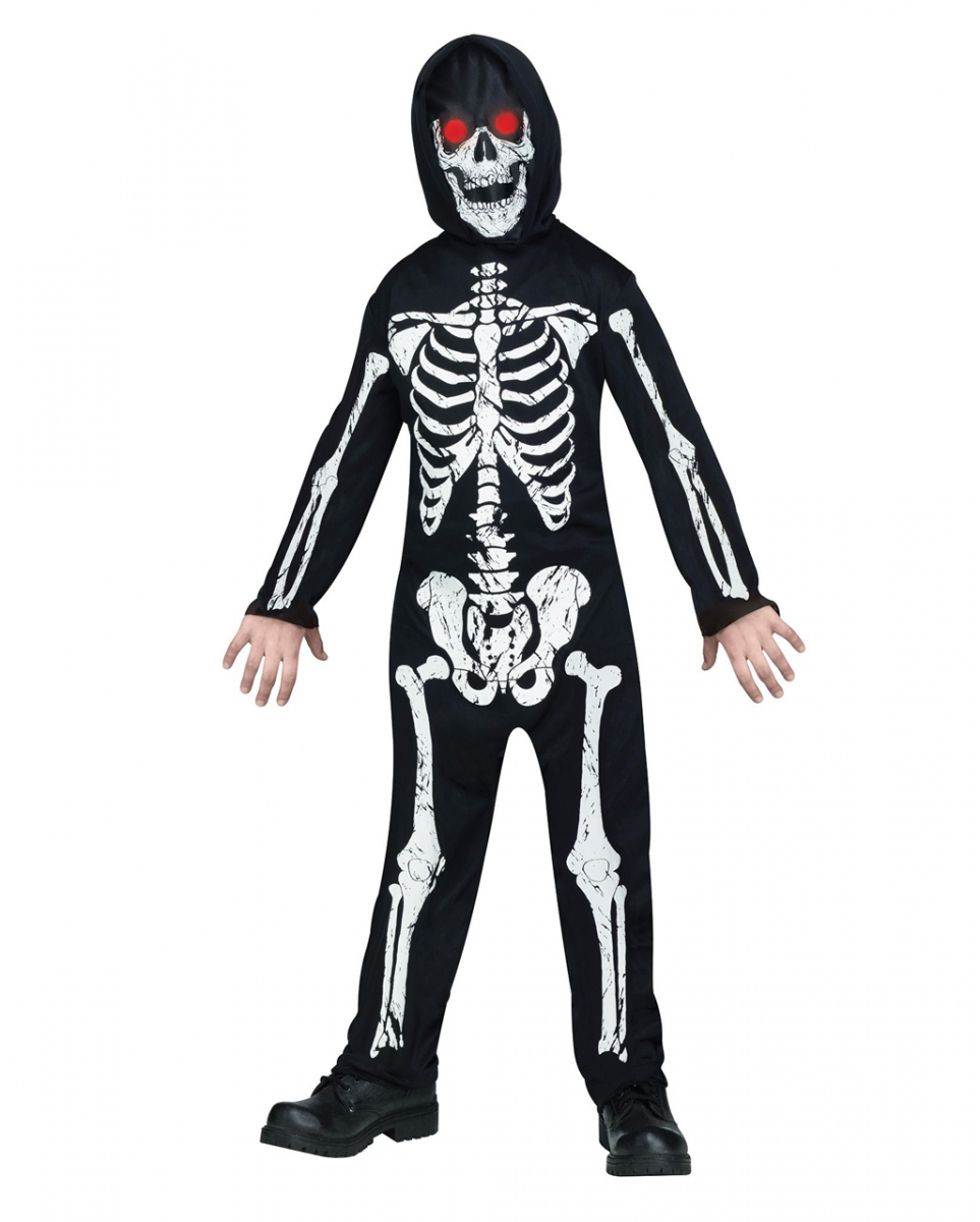 Skelett Kinderkostüm mit beleuchteten Augen Halloween Unisex Kinderkostüm mit Leuchteffekt Unsere Skelett Verkleidung für Kinder kommt mit unheimlichen Leuchtaugen und ist perfekt für den unheimlichen Effekt. Das Skelett Kostüm für Jungen und Mädchen ist zudem mit einer gruseligen Kapuzenmaske ausgestattet. Das Skelett Kinderkostüm mit beleuchteten Augen eignet sich für Kids von 4 bis 14 Jahren. Die Verkleidung kommt als bequemer Overall und ist mit einem Skelett-Print bedruckt. Die Leuchtaugen funktionieren mit Batterien (nicht inkl.) Lieferumfang: 1 x Skelett Kinderkostüm mit beleuchteten Augen Inhalt: 1 x Overall, 1 x Kapuzen-Maske, 1 x Leuchtaugen Farbe: Schwarz, Weiß Größe: S, M, L Material: 100% Polyester, Kunststoff Cooles Kinder Skelett Kostüm mit LED-Effekt Kapuzenmaske aus Stoff mit glühenden Augen Fade In/Out Effekt Unisex Kostüm, passt Jungen und Mädchen Benötigt 3x AA-Batterien, nicht inkl. Größe S ca. 4-6 Jahre M ca. 8-10 Jahre L ca. 12-14 Jahre Brustumfang ca. 55-63 cm ca. 69-76 cm ca. 76-81 cm Taillenumfang ca. 48-55 cm ca. 58-63 cm ca. 60-66 cm Körpergröße ca. 97-117 cm ca. 124-137 cm ca. 139-152 cm Achtung: Der Artikel ist ein Kostüm und kein Spielzeug. Nicht für Kinder unter 3 Jahren geeignet. Kann Kleinteile enthalten, die verschluckt werden können – Erstickungsgefahr. Von Feuer und offenen Flammen fernhalten.