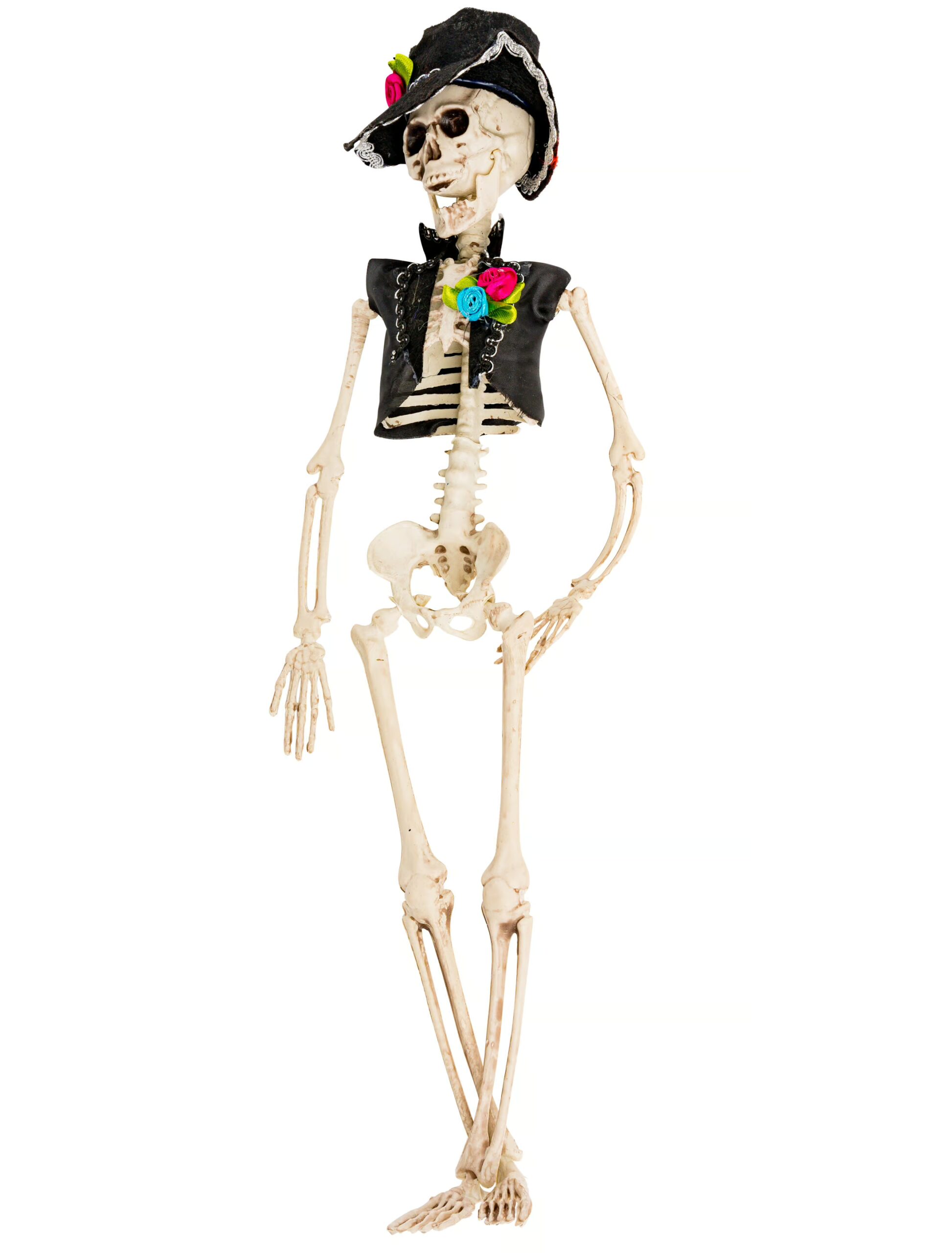 Zu Halloween oder auch zum Dia de los Muertos grüßt dieser freundliche Deko Skelett Mann Deine Besucher. Hübsch angezogen ist er mit einer Handschlaufe versehen, so dass Du ihn dekorativ aufhängen oder auch am Arm mit Dir tragen kannst – bei einer Länge von 42 cm und wenig Eigengewicht ist er ein optimaler Begleiter. Auch eignet er sich super als Accessoire.