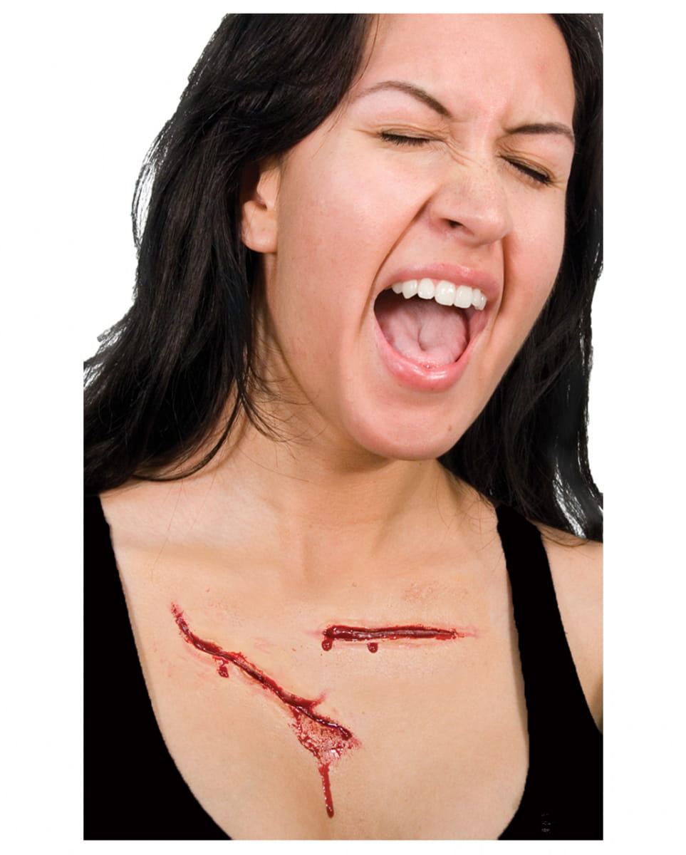2-tlg. Slasher Narben Set Latexwunden Zwei Schnittverletzungen aus Latex als Halloween Make-up Zubehör Kein Horrormovie, der ohne drastische Schnittverletzungen auskommt. Ganz gleich, ob durch ein Messer, eine Machete oder eine Axt verursacht, unser Slasher Narben Latexwunden sind perfekt dazu geeignet, dein Halloween Make-up zu unterstützen. Die Latexapplikation besteht aus aus zwei Schnittverletzungen, die man an jede Stelle des Körpers anbringen kann. Mit dem Slasher Narben Set lassen sich realistische Make-up Effekte für Halloween schminken. Die beiden Slasher Narben aus hochwertigem Latex lassen sich am besten mit Mastix hautkleber oder Flüssiglatex auf die Haut montieren, bevor man diese noch mit Make-up und realistisch aussehenden Filmblut perfektioniert. Die latexapplikation nach Gebrauch einfach wieder abziehen. Diese können vielmals wieder verwendet werden. Lieferumfang: 1 x Narben Set 2 Farbe: hautfarben/Rot Inhalt: 2 Latexwunden Material: Latex Mastix Hautklebe, Flüssiglatex und Unfall Make Up nicht inkl.