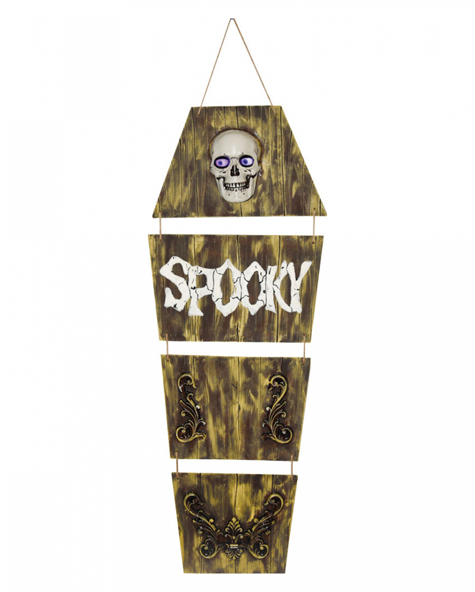 Unheimlicher Sarg mit Totenschädel und sich bewegenden Augen Halloween Deko mit Gruselsound für den Eingangsbereich Lass deine Gäste erschaudern und setze dein Haus mit unserem gruseligen Wandschild in Szene. Unser unheimlicher Sarg mit Totenschädel und sich bewegenden Augen sorgt für Staunen und Gänsehaut! Der Sarg mit animierten Augen ist ca.150 cm groß und gibt geisterhafte Geräusche von sich. Das Halloween Dekoschild besteht aus MDF und einem Seil, an dem es sich befestigen lässt. Batterien sind separat erhältlich. Lieferumfang: 1 x Unheimlicher Sarg mit Totenschädel und sich bewegenden Augen Farbe: Braun, Beige, Weiß Größe: ca. 150 x 30 cm Material: MDF, Seil Batterien: benötigt Batterien, nicht inkl. Halloween sarg Schild zum Aufhängen Sarg als Türdeko mit Sound und Bewegung nach dem Aufhängen ca. 150 cm lang Totenkopf mit animierten Augen und Geister Sound Der Artikel ist ein Dekoartikel. Nicht für Kinder unter 3 Jahren geeignet. Kann Kleinteile enthalten, die verschluckt werden können – Erstickungsgefahr. Von Feuer und offenen Flammen fernhalten.