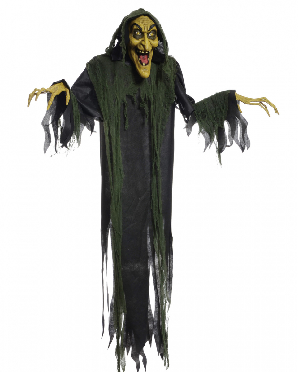 Sprechende Hexe Halloween Figur mit Sound und Lichteffekt 180cm Atmosphärische Deko für Walpurgisnacht zum Aufhängen Jede echte Halloween-Party lebt von stimmungsvollen Dekorationen wie unserer sprechenden Hexe Halloween Figur mit Sound und Lichteffekt 180cm! Die schaurige Deko einer fiesen Hexe eignet sich perfekt für Halloween, Walpurgisnacht und Horror-Partys! Die sprechende Hexe Halloween Figur mit Sound und Lichteffekt 180cm weist eine Größe von ca. 180cm auf. Die Halloween-Hängedeko zeigt eine Hexe wie sie im Buche steht mit fieser Nase, irrem Blick, lückenhaften Zahnreihen und langen, knöchernen Fingern. Die grüne Farbgebung der Haut sowie die schwarzen Gewänder in Fetzenoptik des Halloween-Animatronics sorgen sofort für eine schaurige Stimmung. Kopf und Hände der Halloween-Hängedeko sind detailliert ausgearbeitet für einen täuschend echten Look der Sumpfhexe. Die Arme der Walpurgisnacht-Deko lassen sich biegen für zahlreiche Positionen und über einen Soundmelder aktiviert spricht die Sumpfhexe in typischer Hexen-Manier die Worte: “Ah, another tasty morsel for my stew” – Gruselfeeling garantiert! Lieferumfang: 1 x Sprechende Hexe Halloween Figur mit Sound und Lichteffekt 180cm Farbe: Grün / Schwarz Größe: ca. 180 cm Material: Kunststoff Detailliert ausgearbeiteter Kopf und Hände Biegbare Arme Mit Soundmelder und Lautstärkeregler Sagt: “Ah, another tasty morsel for my stew!” Batterien nicht inkl. Achtung: Es ist wichtig, dass die Halloween Animatronic freistehend, vor dem Zugriff durch Partygäste geschützt, aufgestellt wird. Die Halloween Animatronic besitzt eine sensible Elektronik, die kaputt gehen kann, wenn z.B. verhindert wird, dass sich die Figur bewegen kann. Professionelle Halloween Animatronics sind grundsätzlich Dekorationsartikel zum Ansehen und nicht zum Anfassen! Die Halloween Animatronic ist eine Innendekoration und ist im Außenbereich nur zu verwenden, wenn diese eine trockene Überdachung hat!