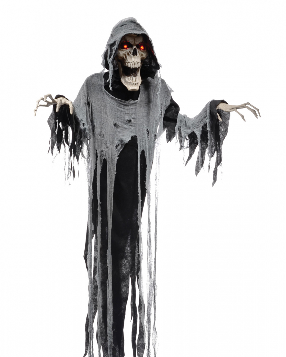 Sprechende Geister Reaper Halloween Figur mit Sound und Lichteffekt 180cm Atmosphärische Deko für Halloween zum Aufhängen Jede echte Halloween-Party lebt von stimmungsvollen Dekorationen wie unserer sprechenden Geister Reaper Halloween Figur mit Sound und Lichteffekt 180cm! Die schaurige Deko eines Totengeistes zum Aufhängen eignet sich perfekt für Halloween und Horror-Partys! Die sprechende Geister Reaper Halloween Figur mit Sound und Lichteffekt 180cm weist eine Größe von ca. 180cm auf. Die Halloween-Hängedeko zeigt einen Totengeist wie er im Buche steht mit Totenkopf, rot leuchtenden Augen in tiefschwarzen Höhlen, Kapuze und langen, knöchernen Fingern. Die beige, beinerne Farbgebung der Haut sowie die schwarz-grauen Gewänder in Fetzenoptik des Halloween-Animatronics sorgen sofort für eine schaurige Stimmung. Kopf und Hände der Halloween-Hängedeko sind detailliert ausgearbeitet für einen täuschend echten Look des Gespenstes. Die Arme der Halloween-Deko lassen sich biegen für zahlreiche Positionen und über einen Sound Sensor aktiviert spricht der Reaper die Worte: “Your Soul is mine…”, gefolgt von einem fiesen Gelächter – Gruselfeeling garantiert! Lieferumfang: 1 x Sprechende Geister Reaper Halloween Figur mit Sound und Lichteffekt 180cm Farbe: Schwarz / Grau / Beige Größe: ca. 180 cm Material: Kunststoff Detailliert ausgearbeiteter Totenschädel und Hände Biegbare Arme Mit Sound Sensor und Lautstärkeregler Sagt: “Your Soul is mine… Ha ha ha ha!” Batterien nicht inkl. Achtung: Es ist wichtig, dass die Halloween Animatronic freistehend, vor dem Zugriff durch Partygäste geschützt, aufgestellt wird. Die Halloween Animatronic besitzt eine sensible Elektronik, die kaputt gehen kann, wenn z.B. verhindert wird, dass sich die Figur bewegen kann. Professionelle Halloween Animatronics sind grundsätzlich Dekorationsartikel zum Ansehen und nicht zum Anfassen! Die Halloween Animatronic ist eine Innendekoration und ist im Außenbereich nur zu verwenden, wenn diese eine trockene Überdachung hat!