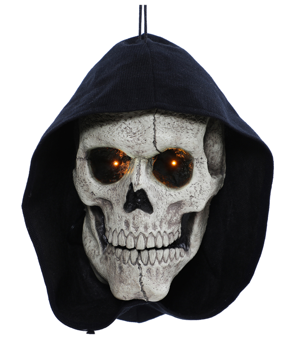 Totenschädel Türdeko mit Licht und Sound Sensenmann Kopf als sprechende Halloween Türdeko Unsere Totenschädel Türdeko mit Licht und Sound bietet eine perfekte Möglichkeit, um deine Gäste unheimlich zu begrüßen. Der sprechende Reaper bewegt seinen Kiefer, redet und leuchtet aus den Augen. Die aus Latex und Kunststoff gefertigte Grim Reaper Türdekoration fungiert als Halloween Türklopfer. Er reagiert auf Bewegung, Licht und Schatte, wodurch er zum leben erwacht. Batterien sind gesondert erhältlich. Lieferumfang: 1 x Totenschädel Türdeko mit Licht und Sound Farbe: Beige, Schwarz Größe: ca. 24 x 19 x 10 cm Material: Latex, Kunststoff, Haube: 100% Polyester Batterien: 3x AA Batterien, nicht inkl. Grim Reaper Kopf als bewegliche, leuchtende Halloween Dekoration Dauerbetrieb oder Bewegungsmelden (reagiert auf Licht und Schatten) Donnergeräusche und englische Sätze beweglicher Kiefer und leuchtende Augen Totenkopf Halloween Türdekoration Sensenmann ",Türklopfer", begrüßt deine Gäste Halloween Deko für den Eingangsbereich