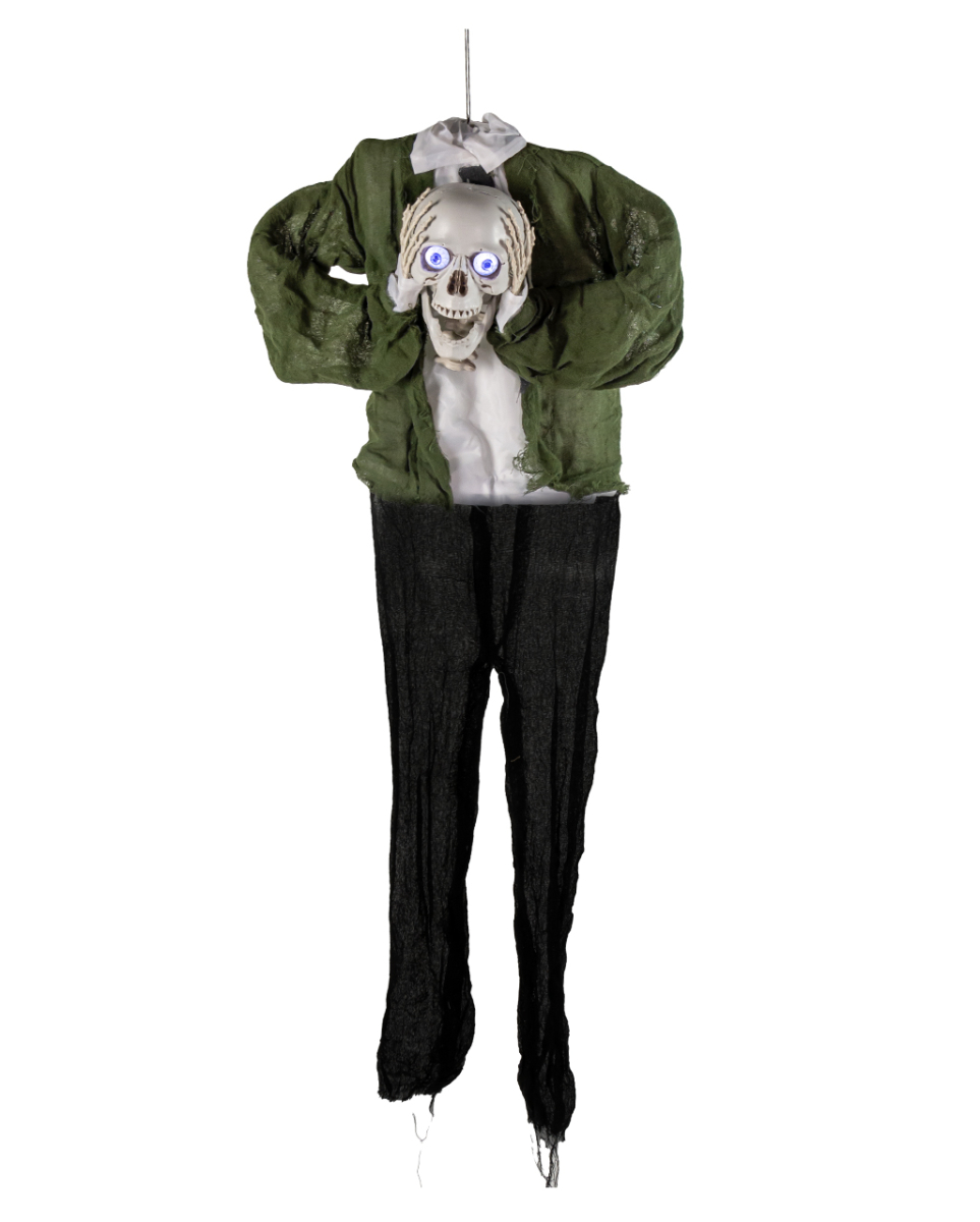 Sprechendes Kopfloses Skelett mit Licht und Sound 145cm Halloween und Geisterbahn Dekofigur zum Hängen Dieses Horror Skelett als Animatronic bringt die nötige Portion Spuk in deine Geisterbahn. Mit LED-Augen und einem beweglichen Kiefer sorgt die Hängedeko für verstörende Momente. Unser sprechendes kopfloses Skelett mit Licht und Sound ist ca. 145 cm groß und besteht aus Kunststoff und Polyester. Der bewegliche Schädel mit Leuchtaugen ist mit beweglichem Kiefer ausgestattet und spricht 3 englische Phrasen. Lieferumfang: 1 x Sprechendes Kopfloses Skelett mit Licht und Sound 145cm Farbe: Beige, Grau, Grün, Blau Größe: ca. 145 cm Batterien: Es werden 3 x AA-Batterien benötigt, nicht inkl. Material: Kunststoff, Polyester Horror Skelett-Animatronic, das seinen sprechenden Kopf in der Hand hält Zombie Figur, die mit geisterhaftem Sound, Licht und Bewegung für Begeisterung sorgt Der abgetrennte Schädel spricht, bewegt dabei den Kiefer und lässt die Augen gefährlich leuchten Aktiviert wird die Figur durch Knopfdruck, Berührung oder laute Geräusche wie Klatschen Fantastische Halloween Gruseldeko die für Eindruck sorgt!