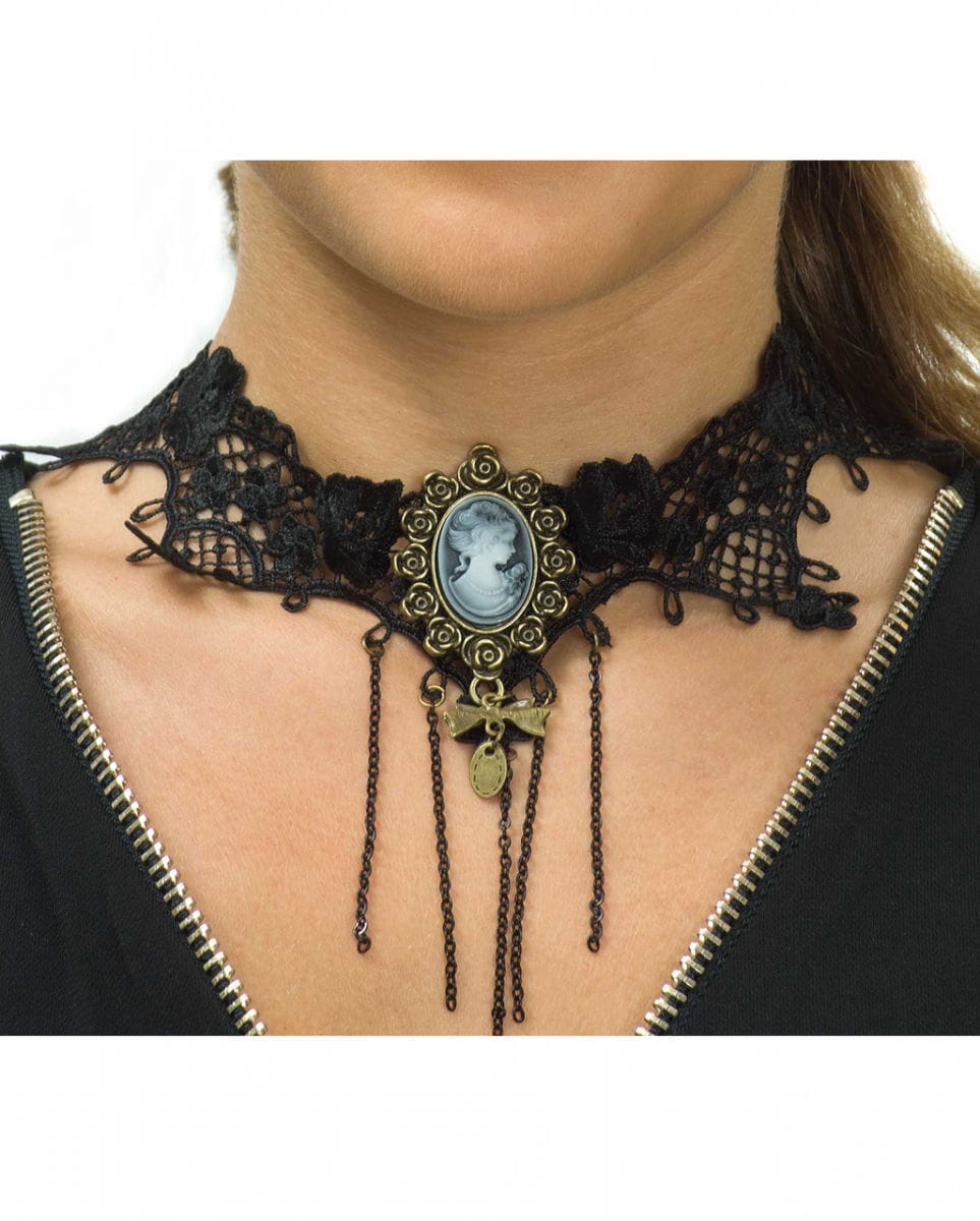 Steampunk Hals Collier Halsschmuck mit Spitze und Anhänger Das Steampunk Hals Collier ist ein wunderschöner Steampunk Schmuck im viktorianischen Stil. Passend zu deinem Steampunk Kostüm, kannst du dieses edle und auffällige Steampunk Collier kombinieren, und dein Outfit massiv aufwerten. Schwarze Spitze und ein goldener Cameo Anhänger schmücken deinen Hals und machen dich zur schönen Steampunk Lady. Das Steampunk Hals Collier ist ca 30cm lang und 5,5 cm breit. Das Spitzencollier mit Cameo Anhänger und Bildeinlass ist ein geniales Kostümzubehör für dein Steampunk Outfit. Der Halsschmuck sieht sehr edel aus und passt durch seinen viktorianischen Stil zur Steampunk Mode oder auch zu Gothic Kostümen. Lieferumfang: 1x Steampunk Hals Collier Inhalt: 1 Stück Farbe: Schwarz/Gold/Grau Größe: Länge ca. 30 cm, Breite ca. 5,5 cm Material: Polyester, Metall Der Artikel ist ein Kostümzubehör für Erwachsene und kein Spielzeug. Nicht für Kinder unter 3 Jahren geeignet. Kann Kleinteile enthalten, die verschluckt werden können – Erstickungsgefahr. Von Feuer und offenen Flammen fernhalten.