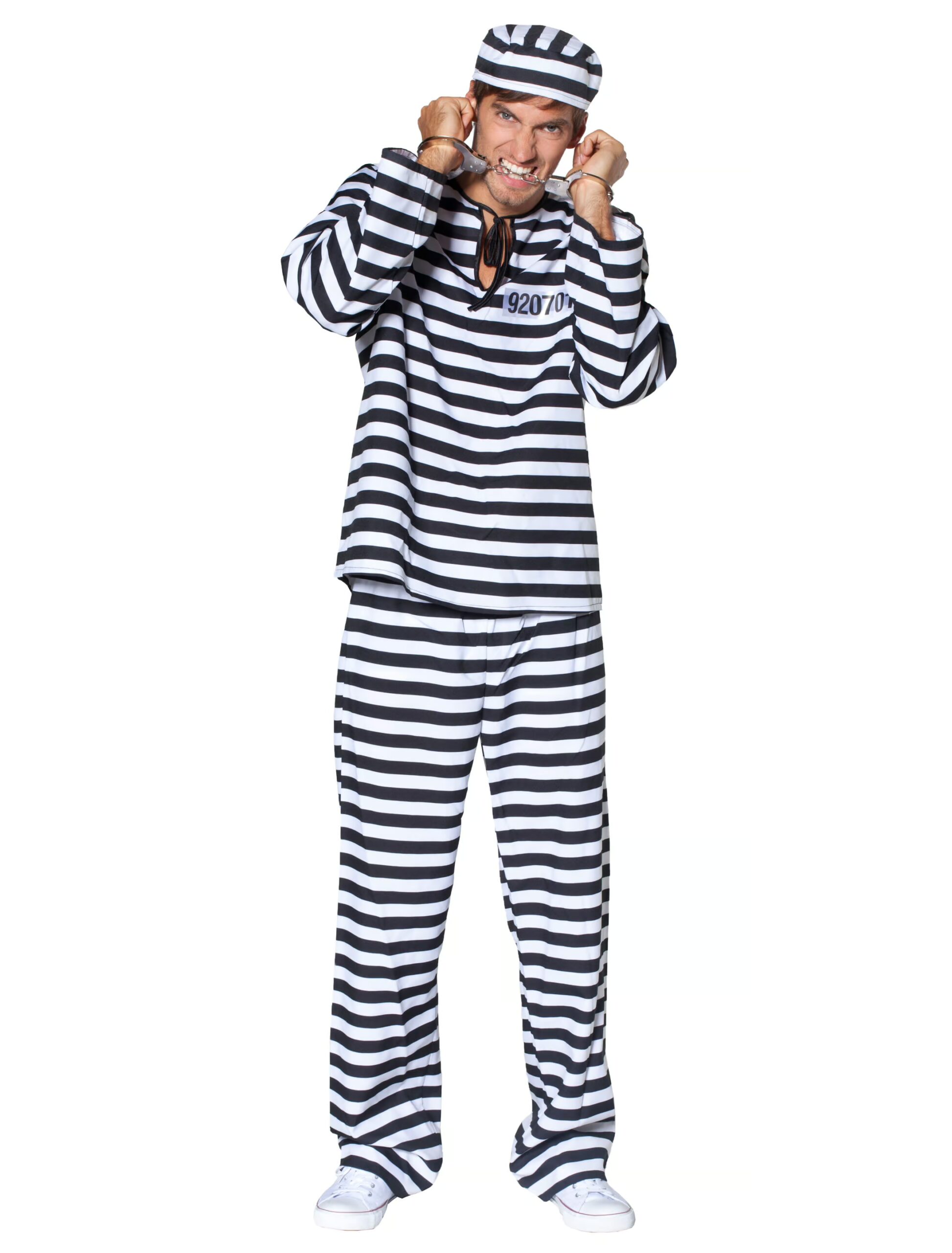 Auf der Flucht vor bösen Cops? Mit diesem Sträflingskosüm für Herren findest Du an Karneval bestimmt ein Versteck, wo Du Deine neugewonnene Freiheit so richtig feiern kannst! Das dreiteilige Kostüm besteht aus einer weit geschnittenen schwarz-weiß gestreiften Hose mit Gummibund, sodass sie sich bequem den ganzen Tag und die ganze Nacht tragen lässt. Das passende Oberteil ebenfalls in schwarz-weißer Optik besitzt lange Ärmel und ist ebenfalls locker und bequem geschnitten. Im Halsbereich lässt es sich mit schwarzen Schnüren binden. Auf der linken Brust befindet sich eine Gefangenen-Nummer “920701”, das Zeichen, dass Du ein echter Ganove und Bösewicht bist. Mit der passenden Sträflings Haube ebenfalls in Schwarz und Weiß ist das Kostüm vollständig. Sei auf Deiner Karnevalsparty der ultimative Verbrecher, denn die Mädels stehen auf böse Jungs. Aber pass’ auf die zahlreichen Polizisten an Karneval auf. Sie wollen Dich schnappen!