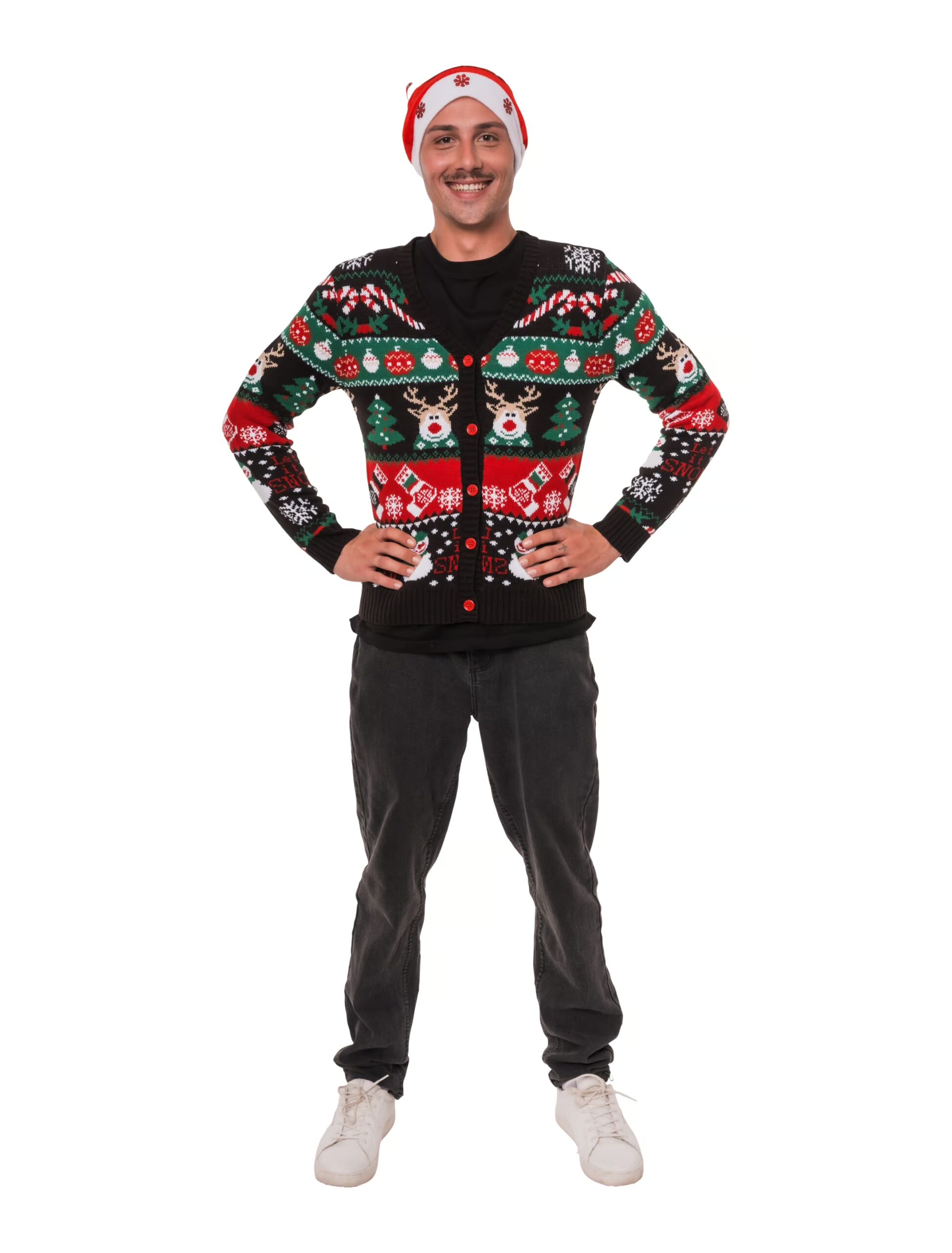 Mit unserer Strickjacke Weihnachten bist du perfekt gerüstet für die festliche Jahreszeit – gemütlich, bunt und mit einem Hauch Humor. Die Jacke lässt sich vorne ganz klassisch mit fünf Knöpfen schließen und begeistert mit einem aufwendigen Muster: Mistelzweige, Zuckerstangen, Christbaumkugeln, Weihnachtsbäume, Rentiere, Weihnachtsstrümpfe, Schneeflocken, Schneemänner und sogar der Schriftzug „Let it Snow“ machen sie zum absoluten Blickfang. Ob Weihnachtsmarkt, Familienfeier oder Ugly-Sweater-Party – mit dieser Strickjacke bist du immer mitten im Geschehen und bringst die Feststimmung gleich mit!