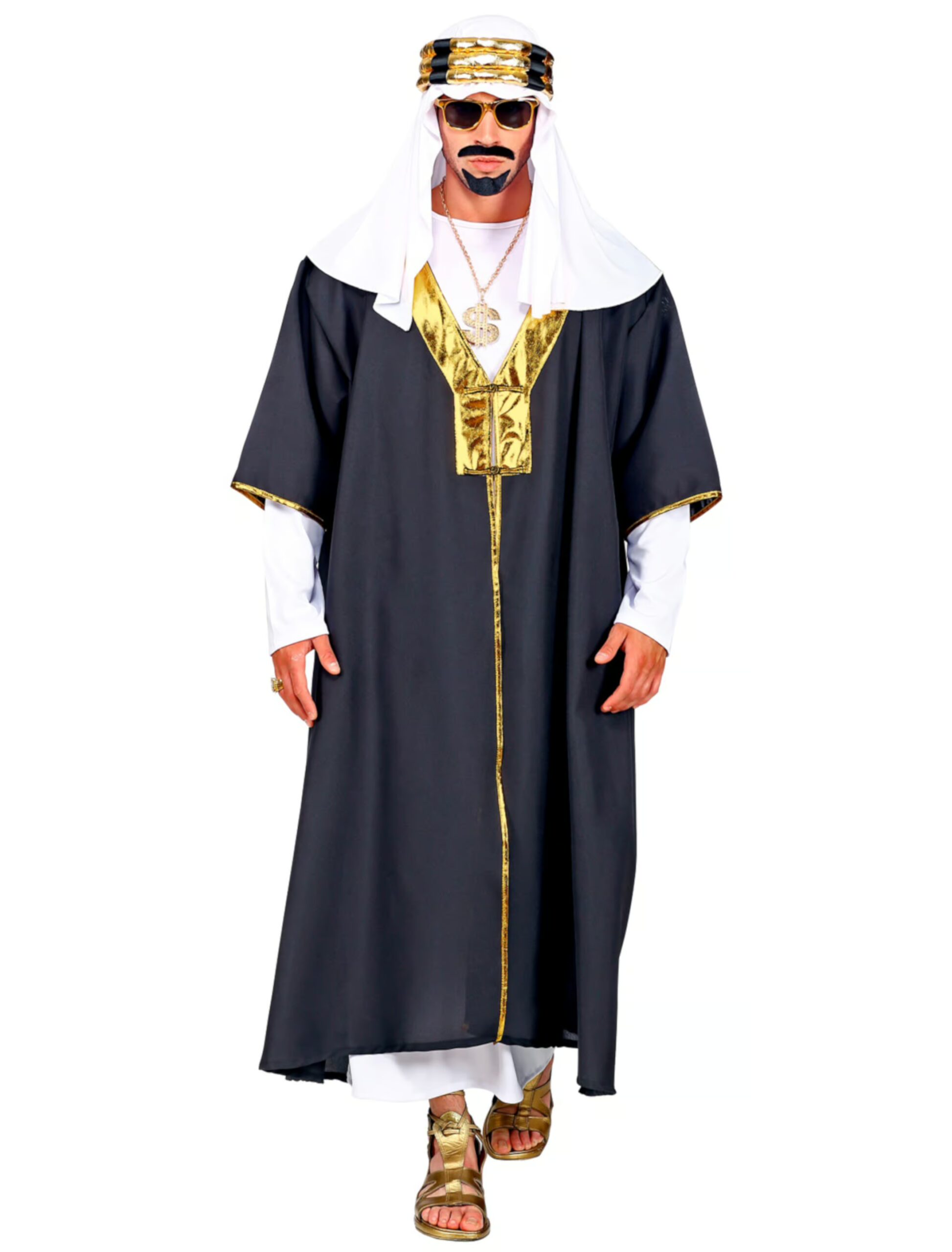 Als orientalischer Fürst und Herrscher eines Ölstaates bist Du in diesem zweiteiligen, schwarz-weißen Sultanskostüm ein interessanter Gast, der auf jeder Motto- und Karnevalsparty gern gesehen ist und der durch seine exotische Ausstrahlung mächtigen Eindruck auf die Anwesenden macht. Charmant und mysteriös zugleich eroberst Du im Handumdrehen die Herzen der Damen. In diesem zweiteiligen Sultanskostüm, bestehend aus der weißen Tunika mit goldgeschmückter schwarzer Robe und dem weißen Kopftuch samt goldenem Stirnband bist Du der absoluter Eyecatcher und stehst im Mittelpunkt. Mit dem passenden Schuhwerk und auffälligen, goldfarbenen Schmuckstücken aus unserem Shop wirst Du für die Damenwelt noch attraktiver und begehrenswerter.