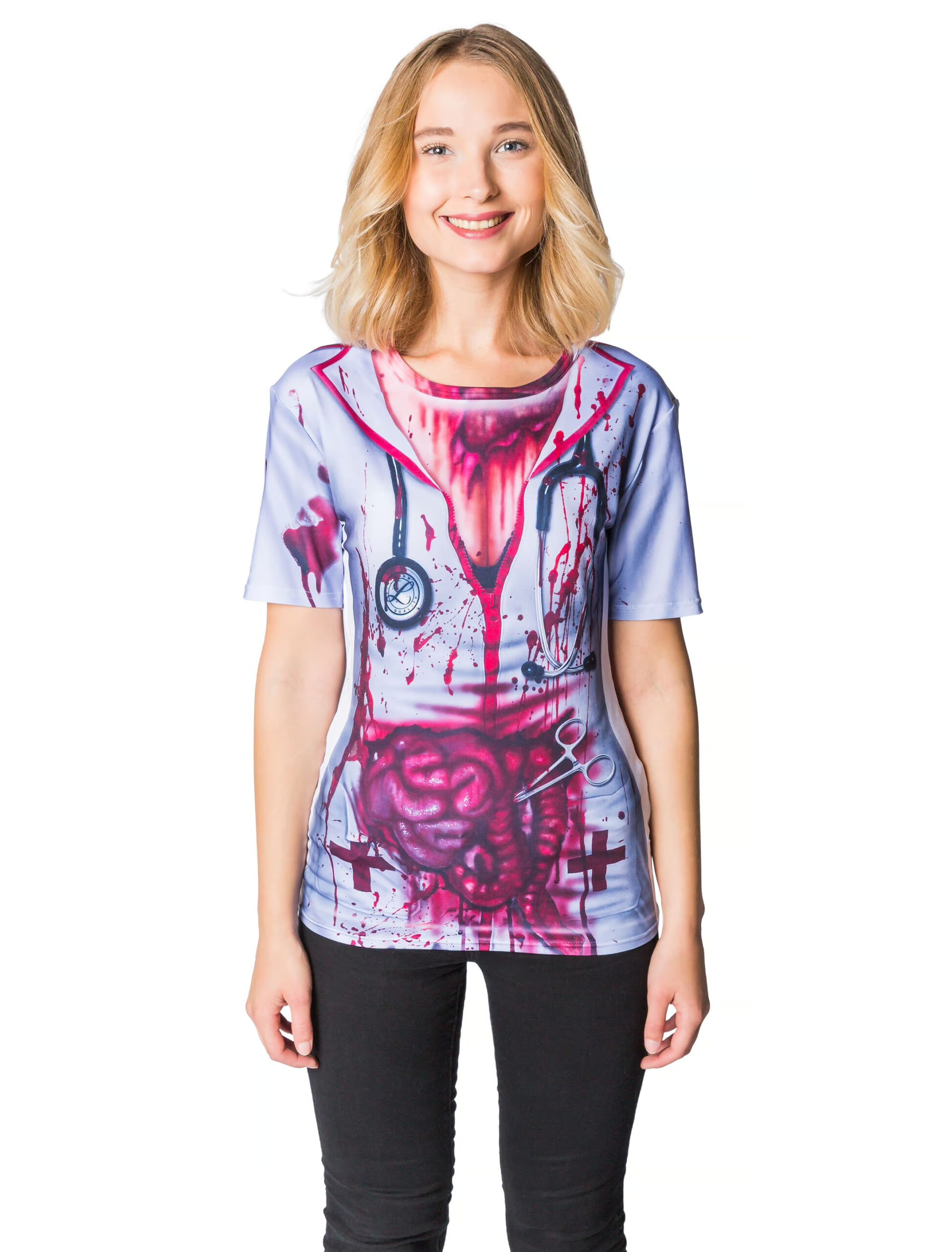Nichts für schwache Nerven! Bei dem Anblick Deines blutverschmierten Krankenschwester Shirts bekommt es garantiert jeder mit der Angst zu tun. Die klaffenden Wunden, die vielen Blutspritzer und eine Schere und eine Spritze machen das Damen Zombie Oberteil zu einem perfekten Schocker für Halloween- und Mottopartys!