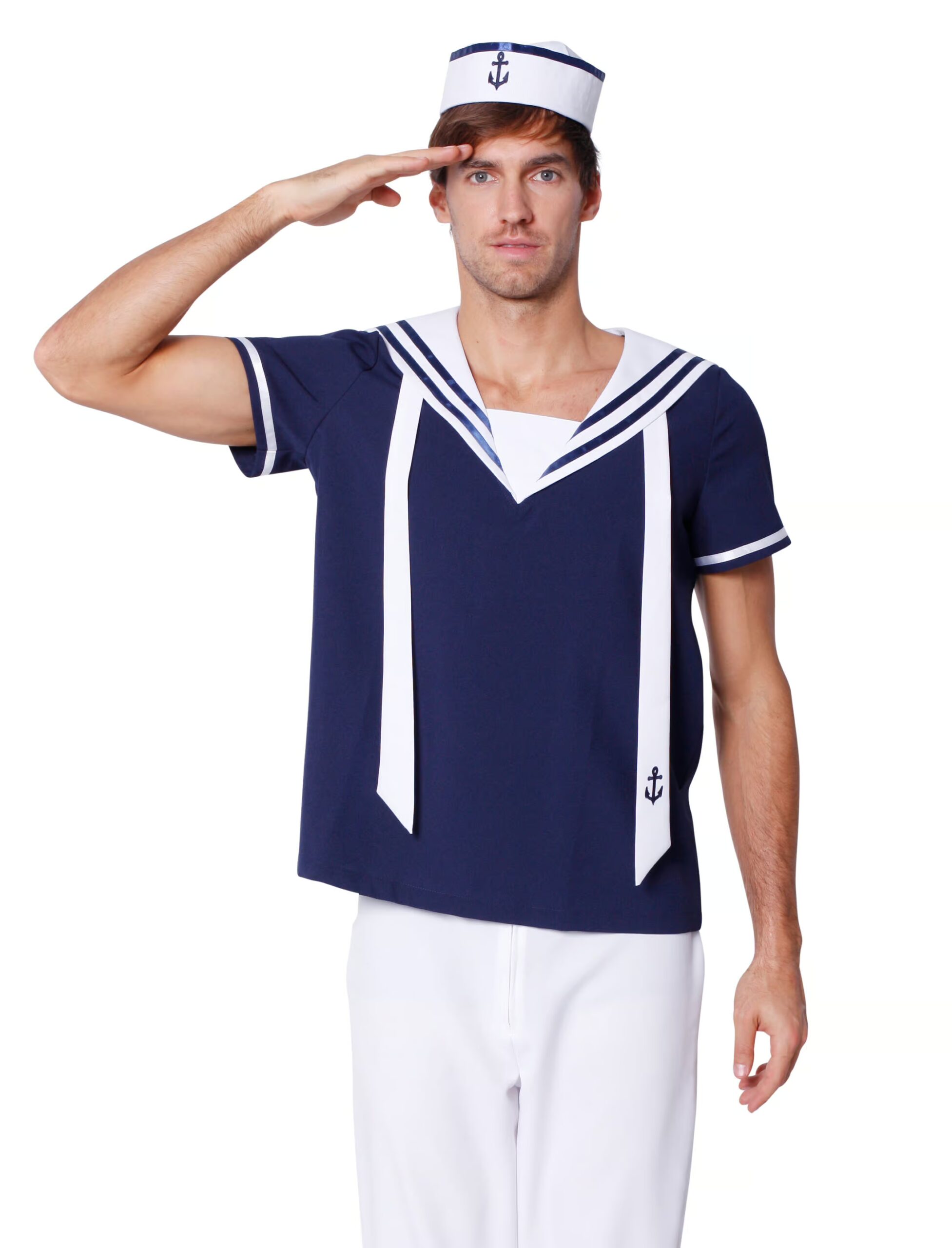 Ahoi und alle Mann an Bord! Dieses T-Shirt ist die perfekte Ergänzung für Dein Kostüm als tüchtiger Seemann. Das dunkelblaue Oberteil ist mit klassischen Streifen, einem großzügigen Ausschnitt und zwei weißen Bändern inklusive Anker-Symbol ausgestattet. Damit verwandelst Du Dich im Nu in einen echten Vorzeige-Matrosen!