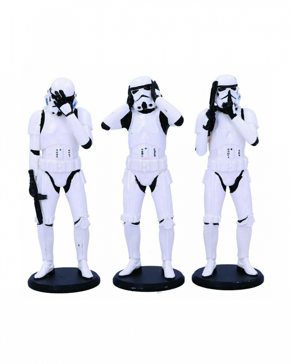 3er Pack Three Wise Stormtrooper Figuren Offizielle Stormtrooper-Figuren in Konfuzius-Stellung Die Star Wars Storm Trooper sind für ihre weißen Uniformen und ihr unbarmherziges Zuschlagen als Soldaten bekannt. Basierend auf den Originalformen, die Andrew Ainsworth von den Shepperton Design Studios hergestellt hat, bekommst du hier ein Stormtrooper-Merchandise, dessen Charakter sich so nah wie möglich an den original Filmrequisiten orientiert. Perfekt für alle Star Wars-Fans! Die drei Stormtrooper-Figuren werden aus feinstem Polyresin gegossen und anschließend sorgfältig von Hand bemalt. Als Star Wars-Merchandise sind die Three Wise Stormtrooper eine grandiose Dekoration und ein fantastisches Geschenk für jeden Sci-Fi-Fan! Hier siehst du drei Troopers, die die alten Analyten von Konfuzius ",Nichts sehen, nichts hören, nichts sagen", darstellen. Der eine Stormtrooper fordert den Zuschauer auf, still zu sein, wenn er seinen Finger über seinen Mund unter dem Helm legt, während der andere seine Ohrlöcher abdeckt, um nichts Böses zu hören. Der letzte Trooper im Trio steht mit dem Kopf in der Hand, offensichtlich kann er nicht glauben, was er da sieht! Lieferumfang: 1 x 3er Pack Three Wise Stormtrooper Figuren Inhalt: 3 Figuren Farbe: Weiß / Schwarz Größe: Jeweils ca. 14 cm Material: Hochwertiges Polyresin Hochwertiges Polyresin, von Hand bemalt Nicht für Kinder unter 3 Jahren geeignet. Kann Kleinteile enthalten, die verschluckt werden können – Erstickungsgefahr.