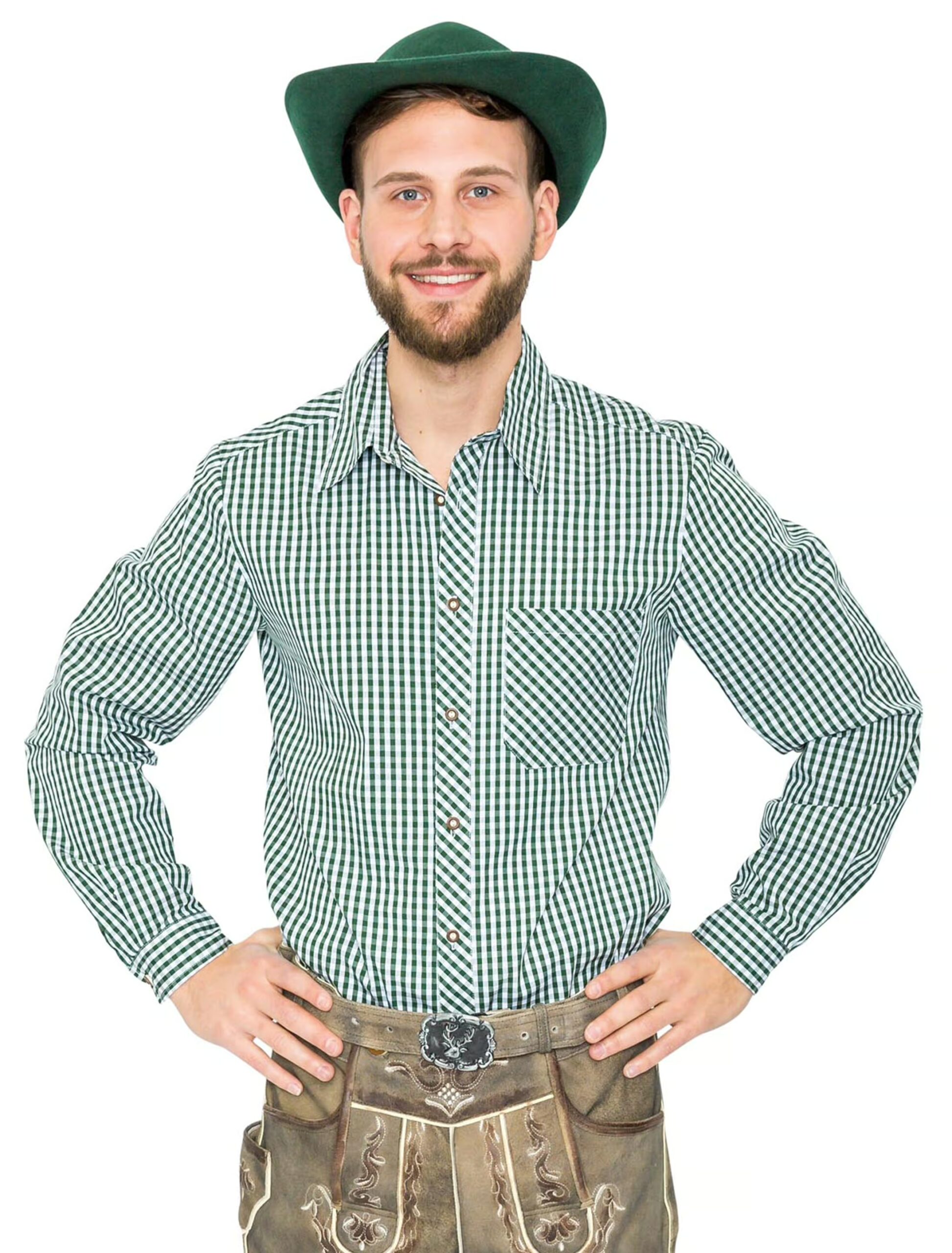 Dieses fesche Hemd macht aus Dir einen stilechten Tiroler! Das Kleidungsstück für Herren besteht aus einem grün-weiß-karierten Stoff, der in der Front von einer Knopfleiste und an den Ärmelsäumen ebenfalls von Knöpfen geziert wird. Die Brusttasche, der schicke Kragen und die Hirsch-Stickerei auf der Rückseite machen das Tirolerhemd zu Deinem Lieblingsstück auf der kommenden Wiesn!
