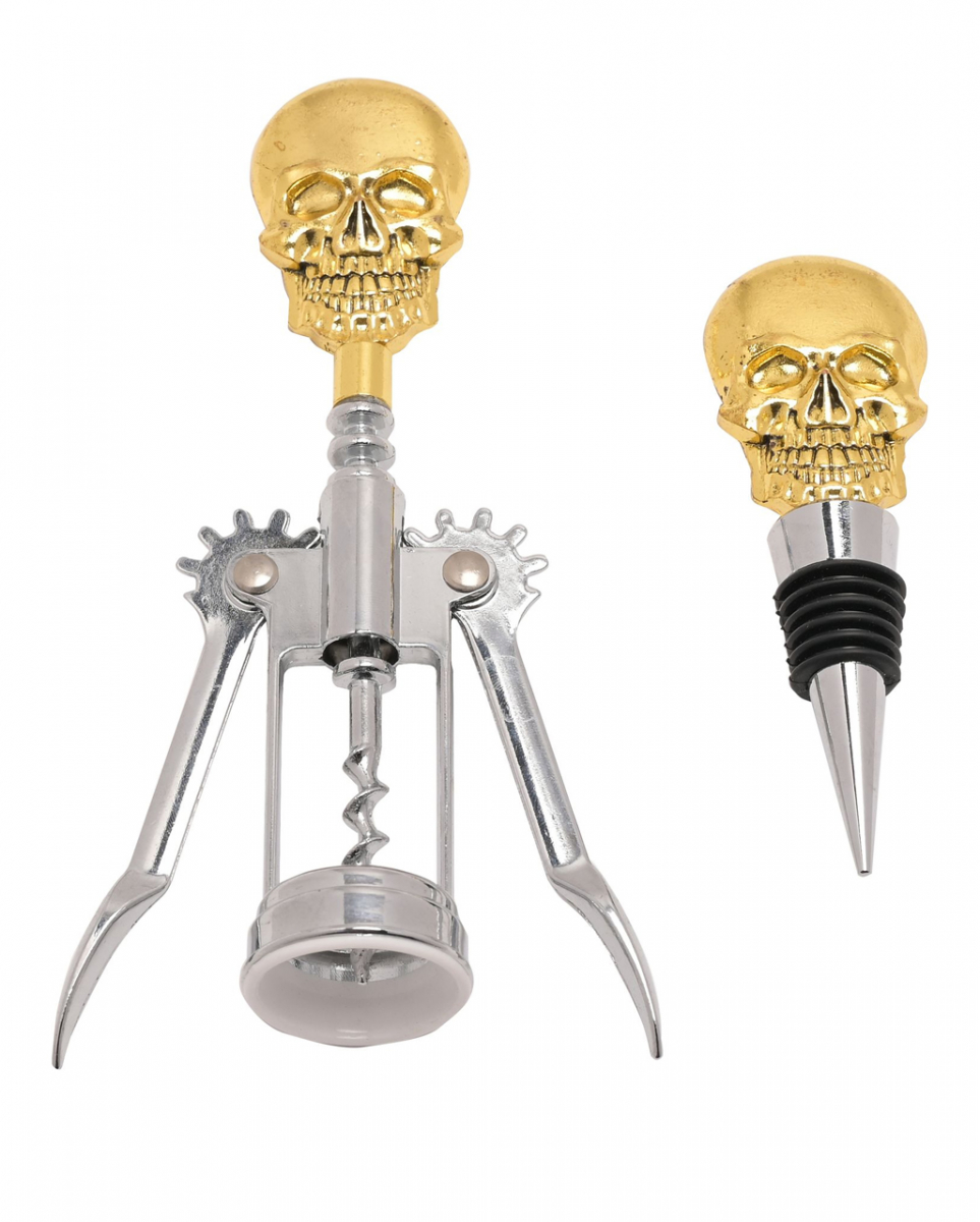 Goldener Totenkopf-Korkenzieher und Totenschädel Weinflaschenverschluss-Set Halloween Korkenzieher und Flaschenverschluss Unser goldener Totenkopf-Korkenzieher und Totenschädel Weinflaschenverschluss-Set ist ein Muss für jede alternative Hausbar. Das Tool fungiert als Korkenzieher und Weinflaschenverschluss – wie praktisch ist das denn?! Unser gold-silberner Korkenzieher und der Weinflaschenverschluss bestehen aus Metall und sind sehr robust und langlebig. Auch als Geschenkidee kommt der Totenkopf Korkenzieher super an. Lieferumfang: 1 x Goldener Totenkopf-Korkenzieher und Totenschädel Weinflaschenverschluss-Set Inhalt: 1 x Totenkopf-Korkenzieher, 1 x Totenkopf-Weinflaschenverschluss Farbe: Gold, Silber Größe: ca. 19 x 6 x 4 cm Material: Metall Zubehör für die Gothic Hausbar 2er-Set mit Korkenzieher und Weinflaschenverschluss Abgefahrenes Totenschädel Design Gothic Wohndekor Kommt in Geschenkbox