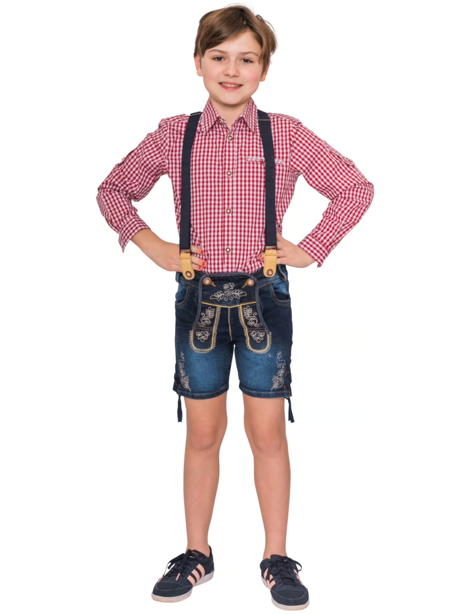 Sehr fesch ist diese praktische und strapazierfähige kurze Trachtenjeans für Kinder, mit der Du aus Deinem Sprössling einen liebenswerten, echten bayrischen Lausbuben machen kannst, der mit lustigen Streichen seine Mitmenschen zu allen Gelegenheiten zum Lachen bringt. Die trendige Trachtenjeans ist am Hosenlatz und an den Hosenbeinen dekorativ bestickt und mit den Knöpfen sowie Schnürungen an den Hosenbeinen versehen. Mit einem rotkarierten Hemd, urigen Hosenträgern und passendem Schuhwerk ist Dein kleiner Lausbub perfekt zum Fasching und Kindergeburtstag angezogen.