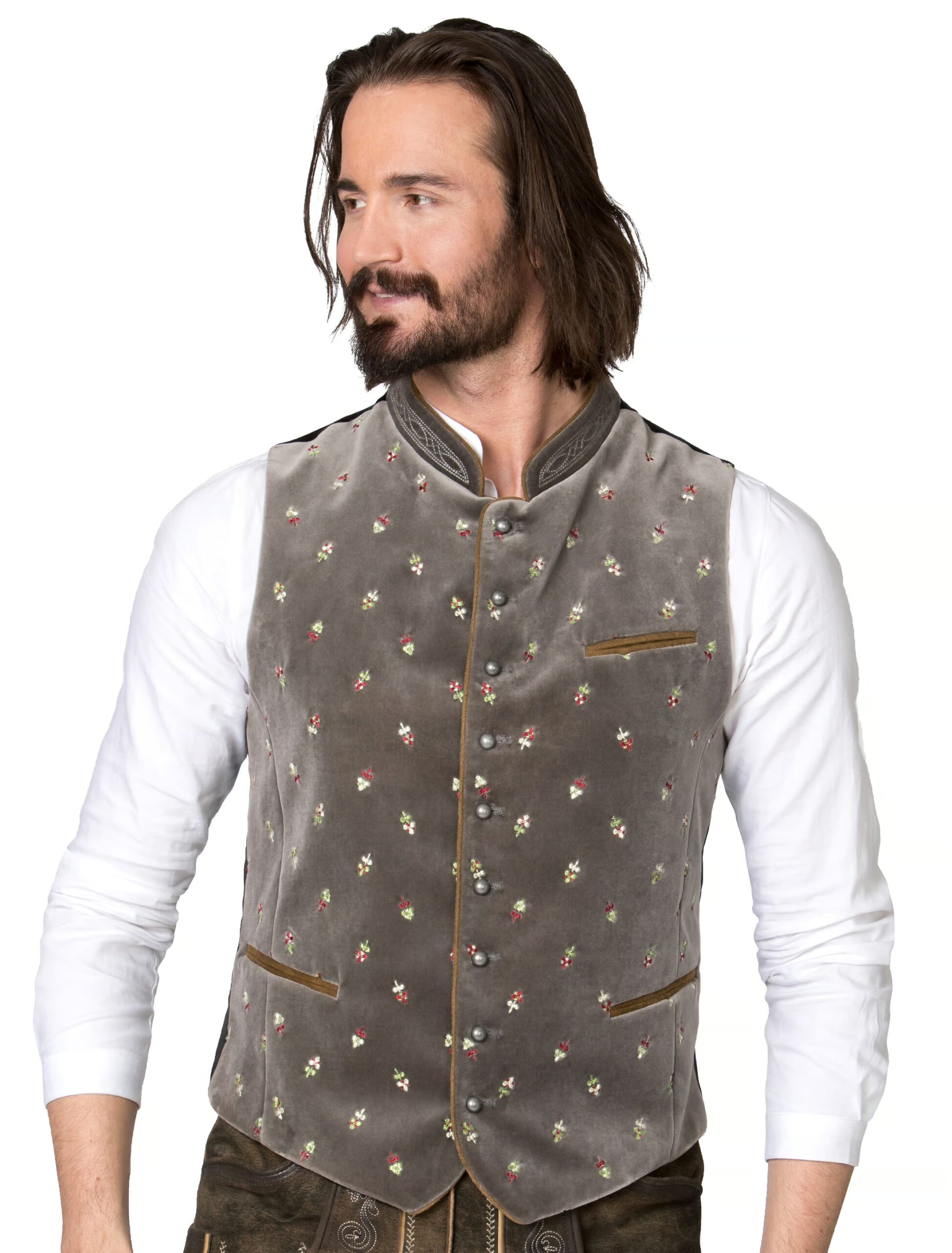 – maskulines Modell aus hochwertigem, bestickten Baumwollsamt – Klassiker unter den Trachtenwesten – verstellbarer Riegel sowie Abnäher auf der Rückseite für eine maskuline Passform – Kontrast-Paspelierungen aus Veloursleder an den drei Taschen – kurzer Stehkragen mit filigranen Stickereien – gekonnt abgerundet wird das Design mit schlichten Knöpfen