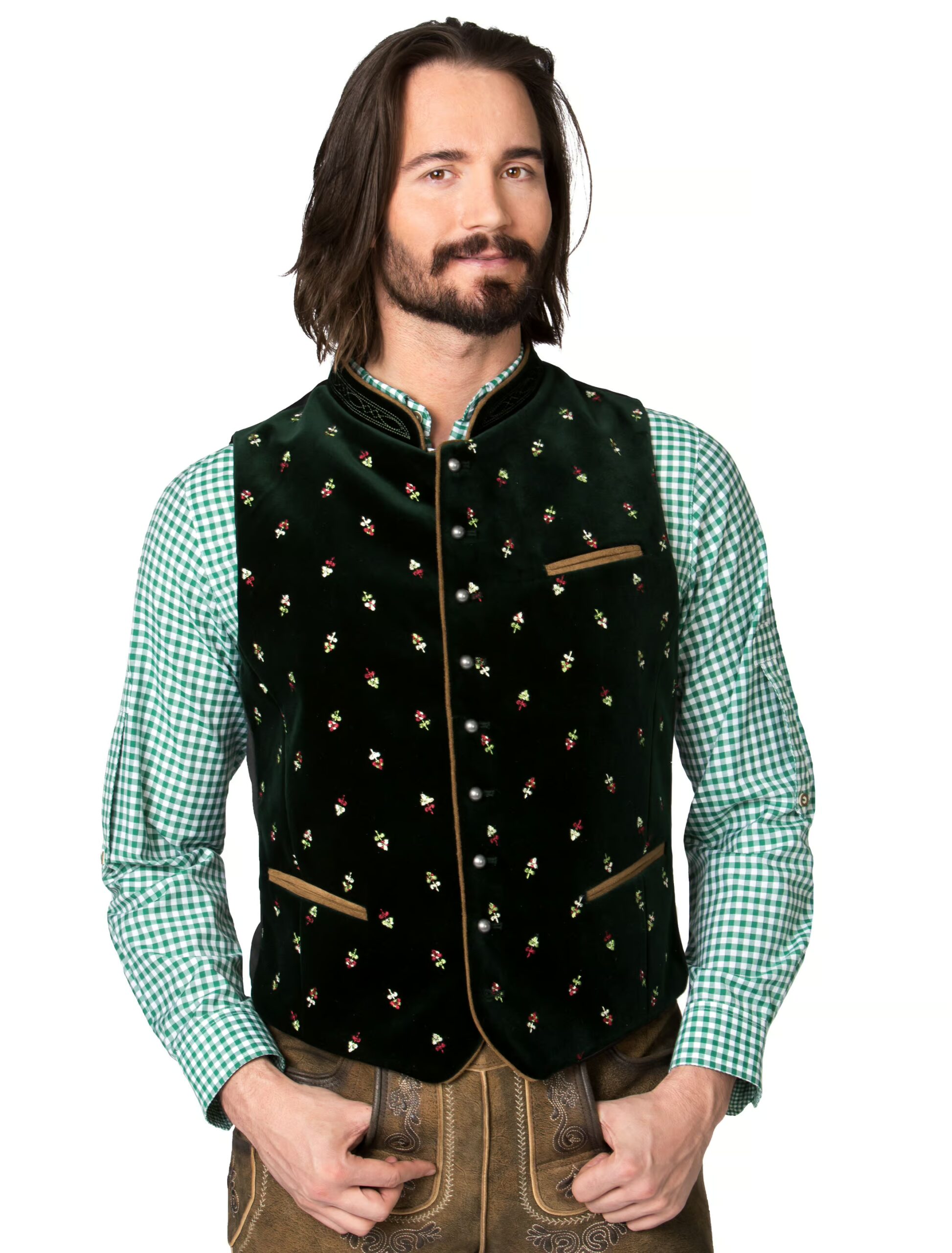 – maskulines Modell in Dunkelgrün aus hochwertigem, bestickten Baumwollsamt – Klassiker unter den Trachtenwesten – verstellbarer Riegel sowie Abnäher auf der Rückseite für eine maskuline Passform – Kontrast-Paspelierungen aus Veloursleder an den drei Taschen – kurzer Stehkragen mit filigranen Stickereien – gekonnt abgerundet wird das Design mit schlichten Knöpfen