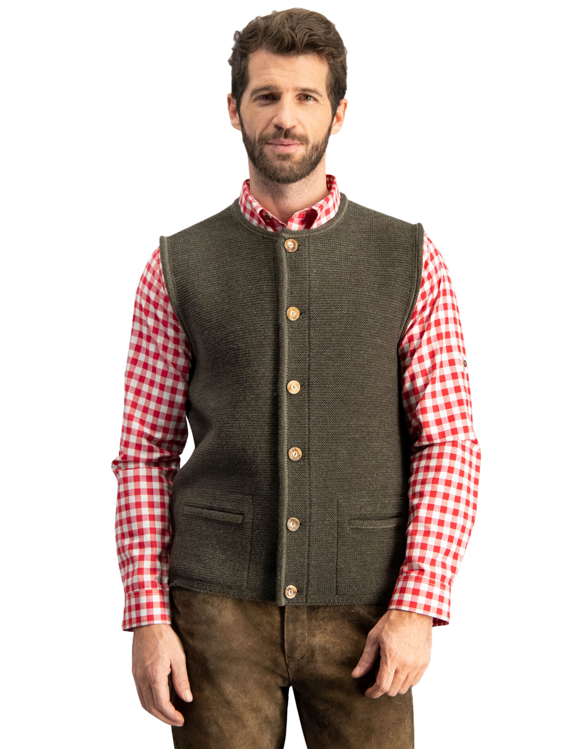 – klassische Weste in Anthrazit aus hochwertiger Wollmischung – rustikale, markante “Links-Links” Strickoptik – farblich abgesetzte Eingrifftaschen und Knopfleiste – mit Knöpfen in Hirschhorn Optik veredelt – Idealer “Allrounder” zu Jeans und zur traditionellen Lederhose!