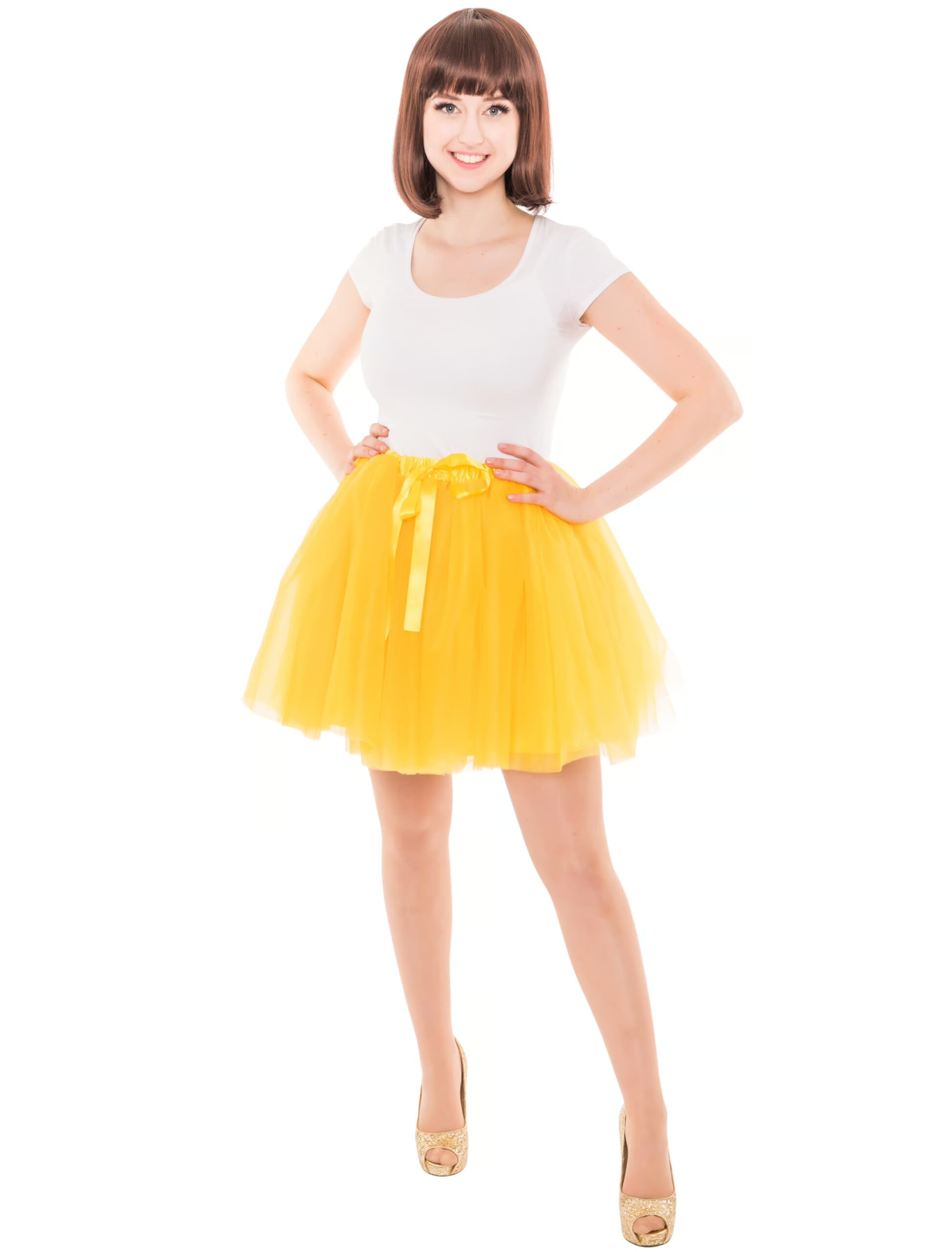 Dieser schicke, kurze Tüllrock in sonnigem Gelb aus pflegeleichtem Polyestermaterial ist ein ideales Basic für einfallsreiche Faschings-, Karnevals- und Party Outfits. Der mehrlagige, gelbe Tüllrock mit dem Satinunterrock und dem Gummizug mit Bindeband am Rockbund ist nicht nur perfekt für bezaubernde Ballerina- und BlumenKostüme, sondern auch auf Badtaste-, Rock and Roll- sowie 80er Jahre Partys machst Du in ihm eine super Figur.