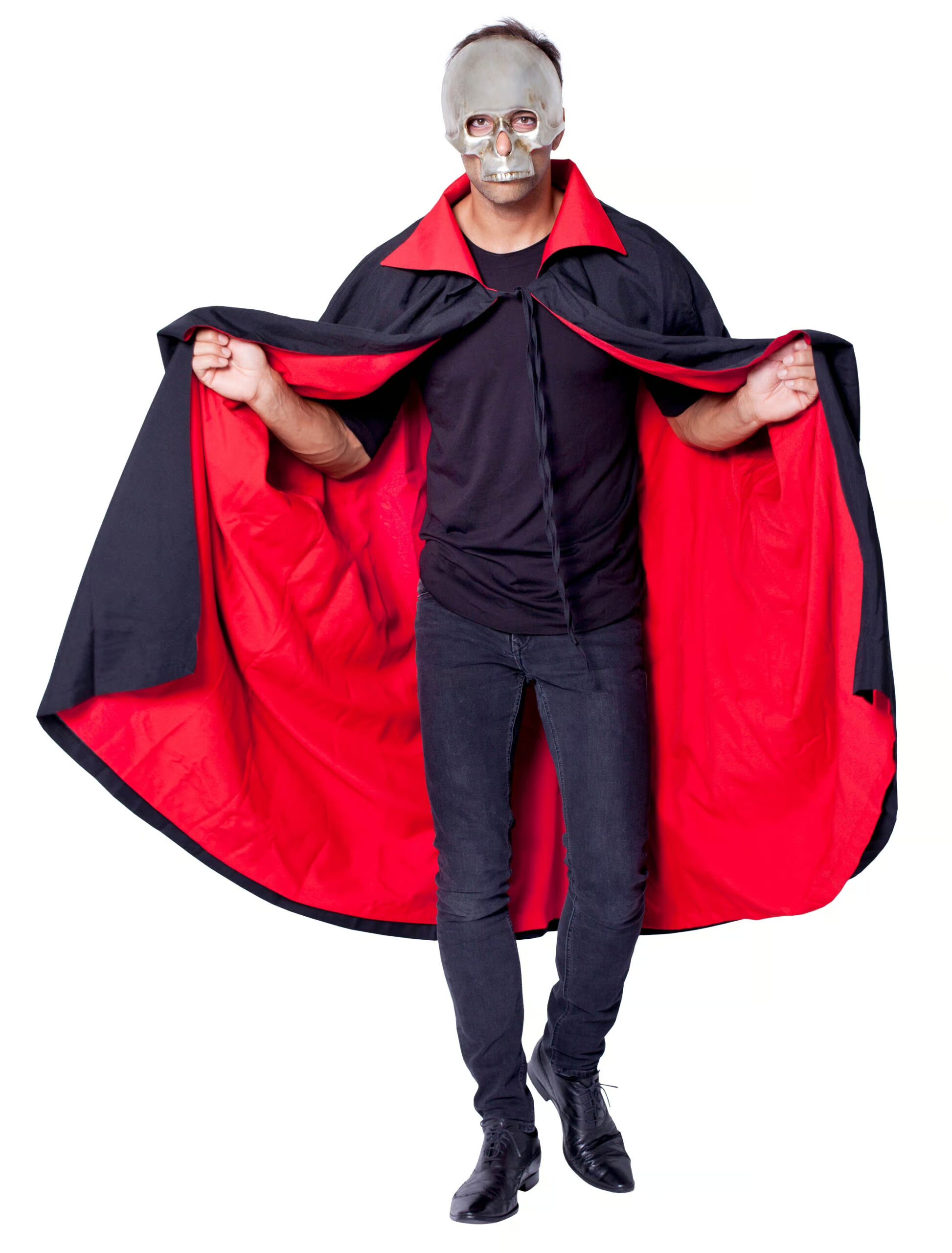 Sei ein echter Blutsauger mit Gruselfaktor! Mit dem Cape Dracula für Herren bist Du garantiert der Fürst der Finsternis auf Deiner Karnevals- oder Halloweenparty! Das schwarze lange Cape reicht fast bis zum Boden und ist mit einem auffälligen Stehkragen ausgestattet. Das gesamte Cape ist mit einem rotfarbenen Satin-ähnlichem Stoff gefüttert, welcher dem Cape düstere Eleganz verleiht. Mit einem passenden farblichen Hemd und ein paar Zubehörteilen findest Du garantiert eine hübsche Dame zum Beißen!