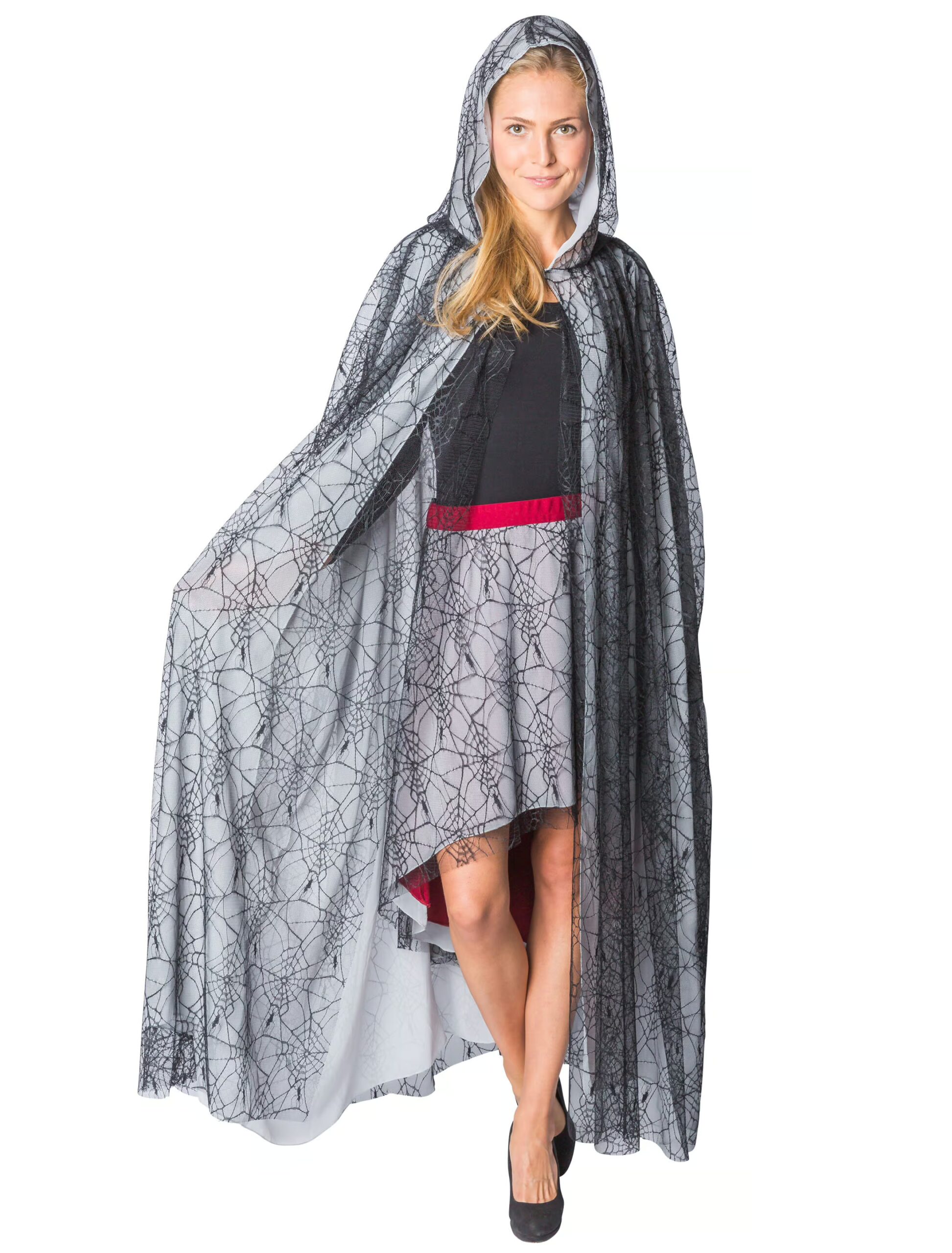 Halloween ist das Fest der Unterwelt! Mit diesem düsteren Umhang bist Du perfekt zwischen all den Vampiren, Hexen, Monstern und Vampiren aufgehoben. Der Umhang besteht aus einem grauen, knöchellangen Stoff, der rundum mit schwarzen Spinnennetzmustern verziert ist. Zusätzlich ist er mit einer Kapuze ausgestattet, die den düsteren Look verstärkt. Unterhalb Deines Halses kannst Du den Spinnen Umhang bequem mit einem Knopf schließen. Dein schaurig-schöner Begleiter für das kommende Halloween!