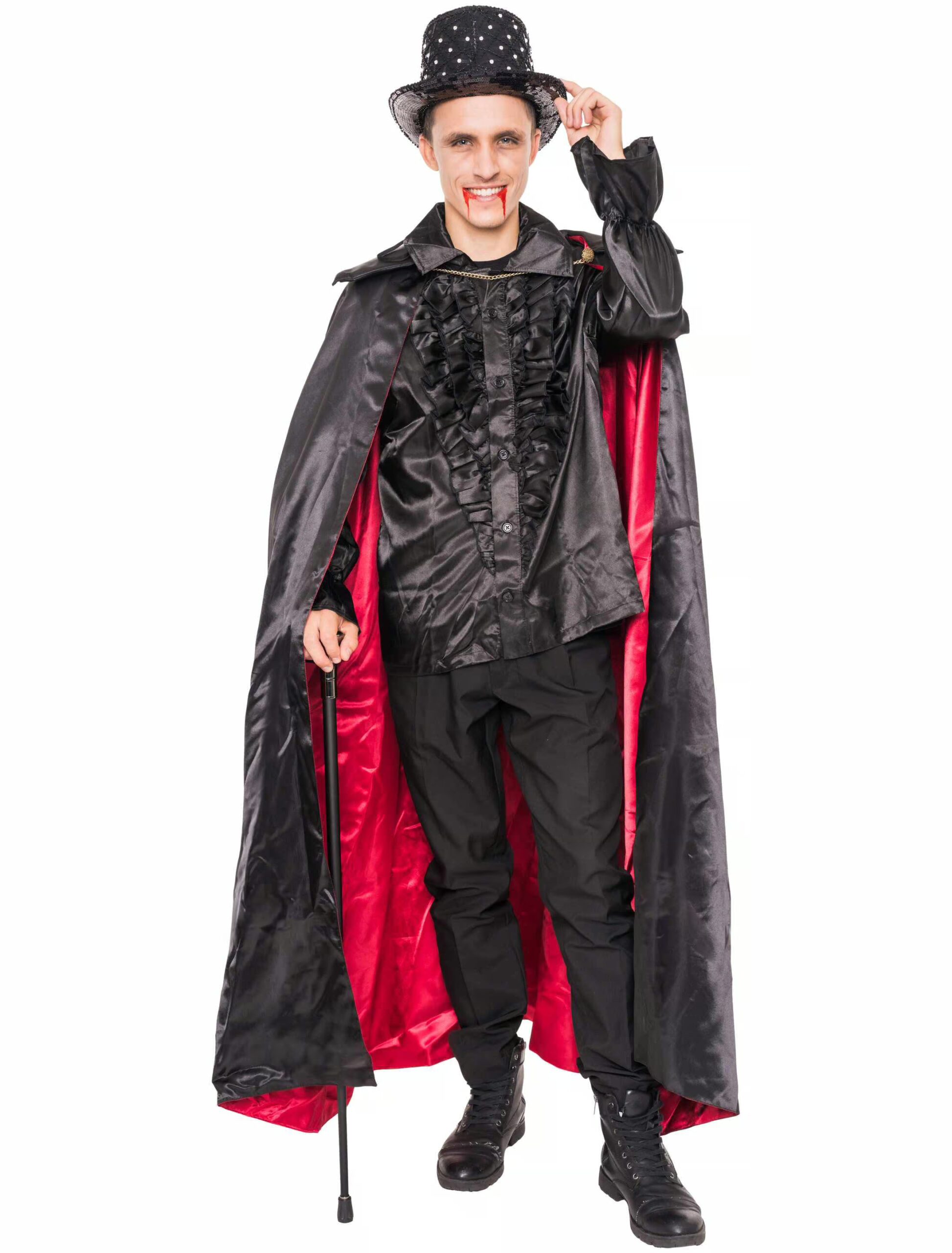 Mit unserem edlen Vampir Umhang ziehst du nicht nur alle Blicke auf dich, sondern hinterlässt auch eine Spur der absoluten Dunkelheit und Eleganz. Der klassische Umhang mit Kragen verleiht dir den unverkennbaren Look eines wahren Grafen. Ob du als unheimlicher Charmeur durch die Straßen schleichst oder auf der Halloween-Party zum unvergesslichen Highlight wirst – dieser Umhang macht’s möglich!