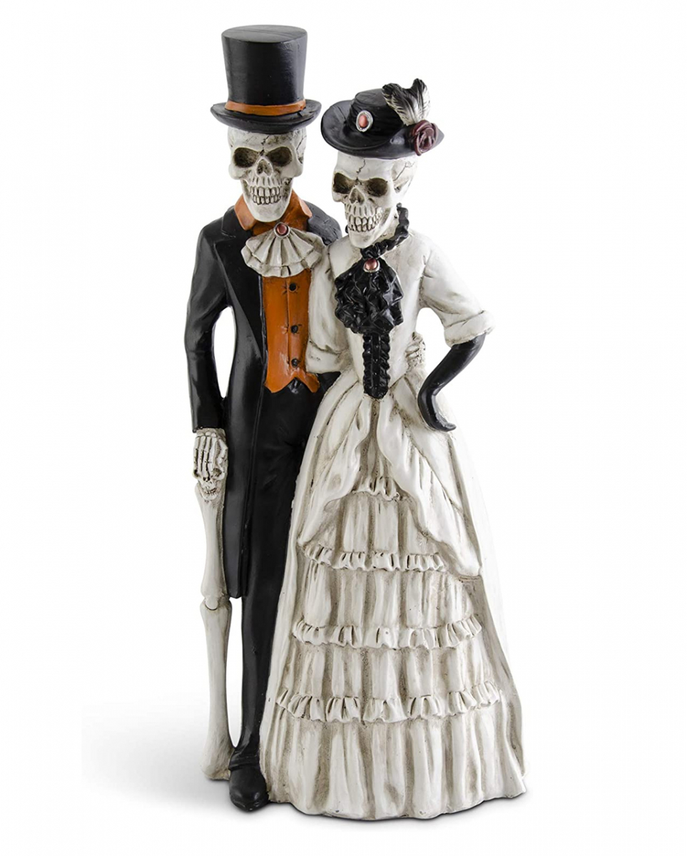 Edel gekleidetes Skelett Paar 43cm als Gothic und Halloween Deko Hol dir das elegante Knochengerippe Paar im viktorianischen Stil als Hingucker in deiner Gothic Einrichtung Dass die Liebe bis über den Tod hinaus andauern kann, beweist unser Edel gekleidetes Skelett Paar aus Kunststein. Die riesigen Skelett Figuren geben einen sehr stilvollen Anblick ab. Kleid und Anzug sitzen perfekt, auch die Körperhaltung stimmt. Das edel gekleidete Skelett Paar ist eindrucksvolle 43 cm groß und aus robustem Polyresin gearbeitet und liebevoll von Hand bemalt worden. Die Steampunk Deko Figur zeigt ein viktorianisch gekleidetes Skelett Paar, welches sich mit einem Arm umschlingt. Lieferumfang: 1 x Edel gekleidetes Skelett Paar 43cm Farbe: Schwarz, Weiß, Orange Größe: ca. 43 cm Material: Polyresin (Kunststein) Brillant aussehende Halloween und Gothic Deko Klassischer, viktorianischer Look Perfekt als Hochzeitsgeschenk Hochwertige Verarbeitung mit vielen Details Gegossen aus feinstes Polyresin Sorgfältig von Hand bemalt Der Artikel ist ein Wohnaccessoire und kein Spielzeug. Nicht für Kinder unter 3 Jahren geeignet. Kann Kleinteile enthalten, die verschluckt werden können – Erstickungsgefahr. Von Feuer und offenen Flammen fernhalten.