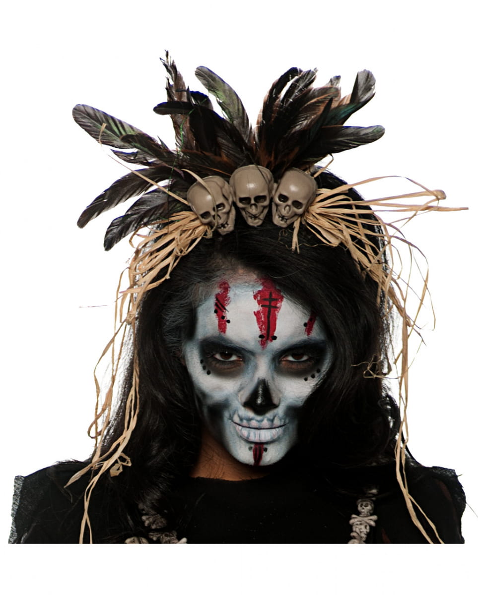 Totenschädel Kopfschmuck als Voodoo Kostümzubehör Gruseliges Accessoire für deine Verkleidung als Witch Doctor Mit dem Totenschädel Kopfschmuck als Voodoo Kostümzubehör wird die nächste Halloween-Party zum okkulten Treffpunkt düsterer Hexen und Magier. Auch zur Karnevalszeit ist der Haarschmuck das ideale Accessoire für dein schwarzer Priester Kostüm. Der Totenschädel Kopfschmuck ist mit drei kleinen Skulls und großen schwarzen Kunstfedern verziert. Mit diesem Accessoire kannst du als hawaiianische Hexe dein Unwesen treiben. Lieferumfang: 1 x Totenschädel Kopfschmuck als Voodoo Kostümzubehör Farbe: Schwarz/Grau/Beige Größe: Einheitsgröße für Erwachsene Material: Kunststoff/Kunstfedern Witch Doctor Kopfschmuck im Voodoo Style Make-up nicht inklusive Der Artikel ist ein Kostümzubehör für Erwachsene und kein Spielzeug. Nicht für Kinder unter 3 Jahren geeignet. Kann Kleinteile enthalten, die verschluckt werden können – Erstickungsgefahr. Von Feuer und offenen Flammen fernhalten.