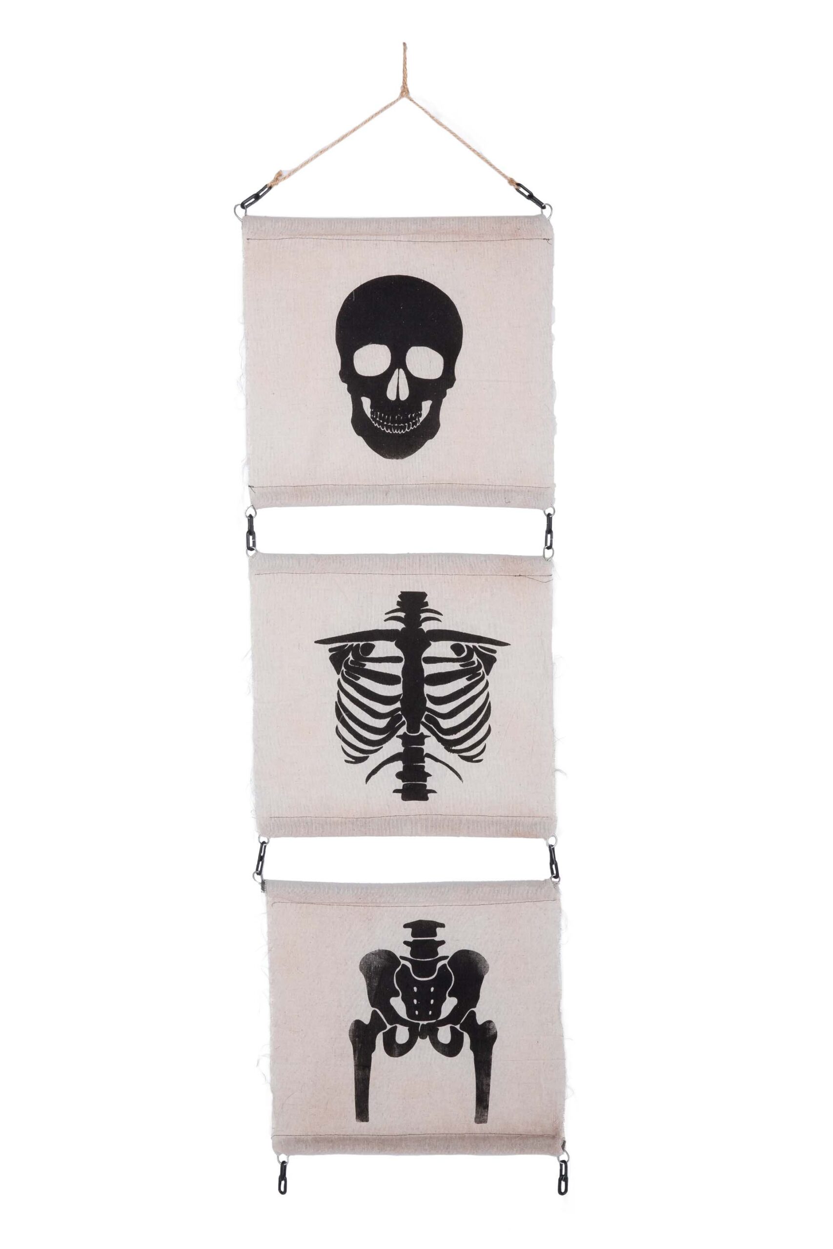 Wer seine Halloween-Party mit einer ganz besonders ausgefallenen Skull & Bones Deko aufpeppen möchte, ist mit der Wand Flagge Skelett genau an der richtigen Adresse. Drei durch Schlaufen miteinander verbundene Flaggenteile bilden den skelettierten Kopf, Brustkasten und Unterleib ab – ein unheimlicher Anblick, der auch jede Piratenparty in Stimmung bringt. Dank der integrierten Schlaufe am obersten Flaggenteil lässt sich die Gruseldeko ganz einfach an Decken und Wänden aufhängen.