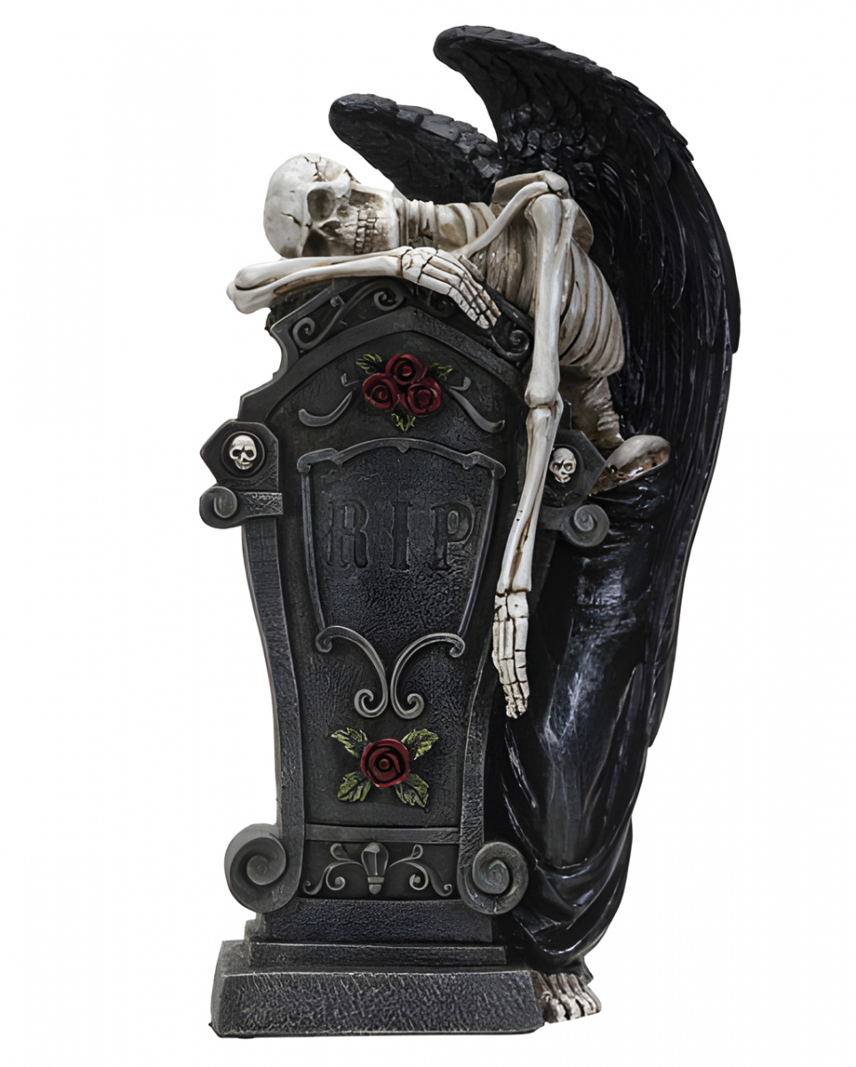 Trauernder Todesengel am Grabstein mit Rosen 40cm Geflügeltes Skelett am Grabmal, das um seine Liebe trauert Unser trauernder Todesengel am Grabstein mit Rosen ist ein romantisch-düsterer Deko-Artikel, der dein Zuhause bereichert. Hier lehnt ein weinendes Gerippe am Grabstein und trauert um seine verstorbene Liebe. Unser geflügeltes Skelett am Grabstein ist 40 × 24 × 11,5 cm groß. Die Figur ist von Hand bemalt und mit viel Liebe zum Detail gefertigt. Die Knochenfigur ist eine mystische Deko und Geschenkidee für Fans von Gothic Homeware. Lieferumfang: 1 x Trauernder Todesengel am Grabstein mit Rosen 40cm Farbe: Schwarz, Beige, Grau, Rot Größe: ca. 40 × 24 × 11,5 cm Gewicht: 1,6 kg Material: Polyresin (Kunststein) Geflügelte Skelett Figur für Liebhaber des Morbiden Weinendes Gerippe an einem schwarzen Grabstein Große Flügel bekleiden den Todesengel Aus Kunststein gefertigt Detailliert von Hand bemalt Der Artikel ist ein Dekorationsartikel. Von Feuer und offenen Flammen fernhalten.