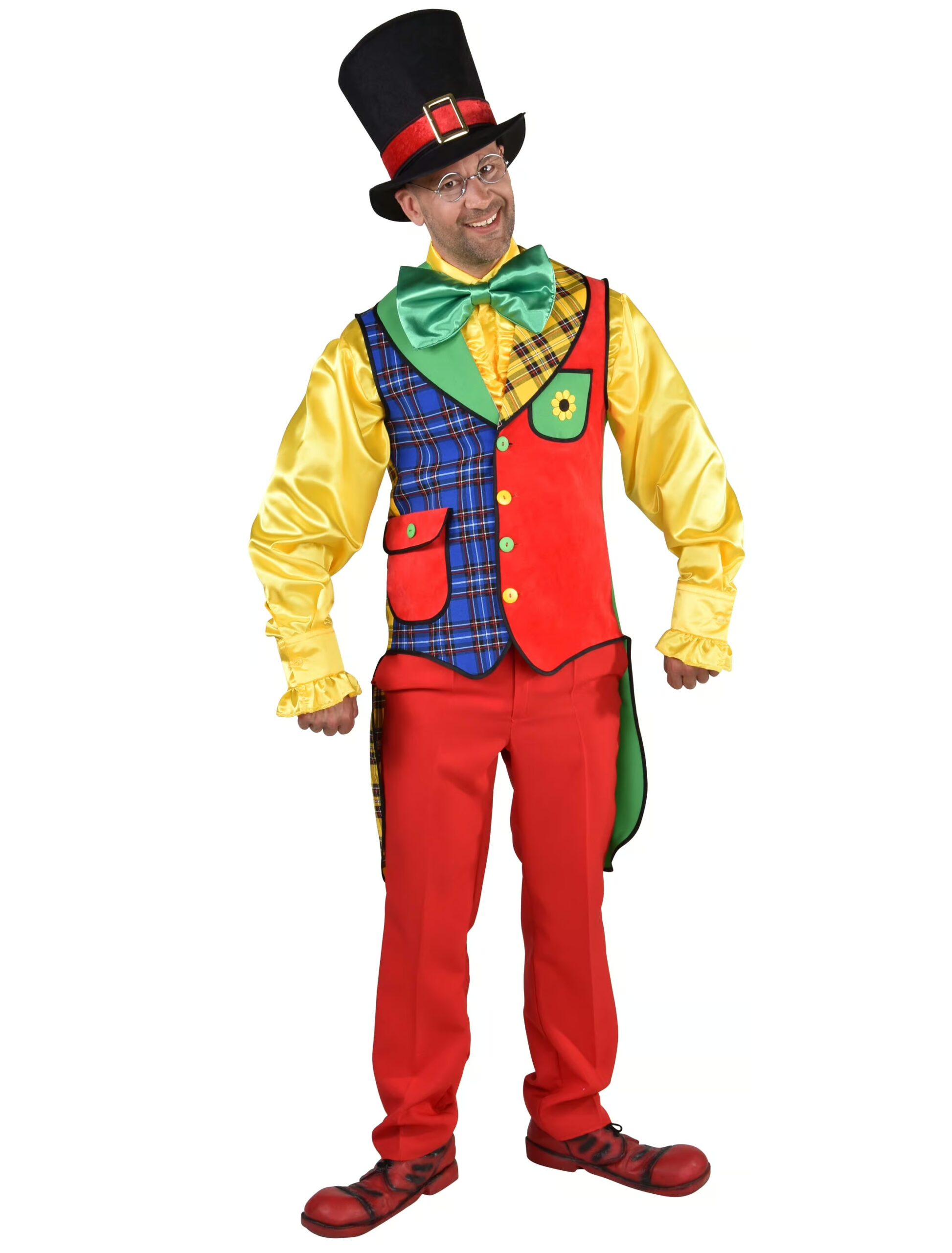 Mit unserer bunten Weste für Clowns in der Deluxe Version sorgst Du für gute Laune und Partystimmung auf jedem Karnevalsfest. In mehreren Größen kannst Du die Zirkus Weste für Herren bei uns im Shop erwerben und sie mit Accessoires wie einer Clown Perücke oder einer roten Nase kombinieren. Bunte Knöpfe und eine hübsche Sonnenblume zieren die Frontseite des Oberteils, das man auch bei Auftreten auf Kindergeburtstagen sehr gut tragen kann. Exklusiv Artikel.