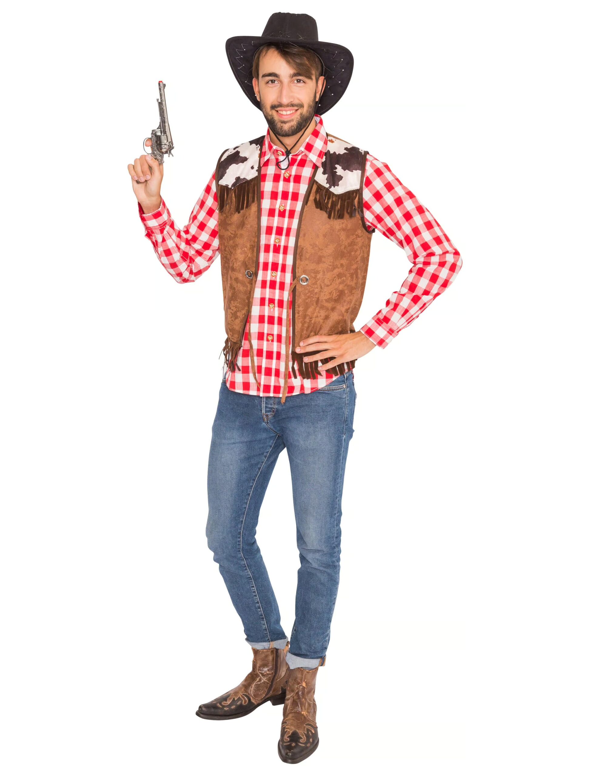 Howdy! Mit dieser Cowboy Weste in brauner Leder-Optik könntest Du sofort in jedem Wild-West-Streifen mitspielen. Die Weste ist mit typischen Fransen in Dunkelbraun und einem Kuhfell-Imitat an den Schultern verziert. Die perfekte Ergänzung für Dein Cowboy Kostüm! Jetzt nur noch ein Paar Lederchaps, einen Revolver und einen schicken Cowboyhut.