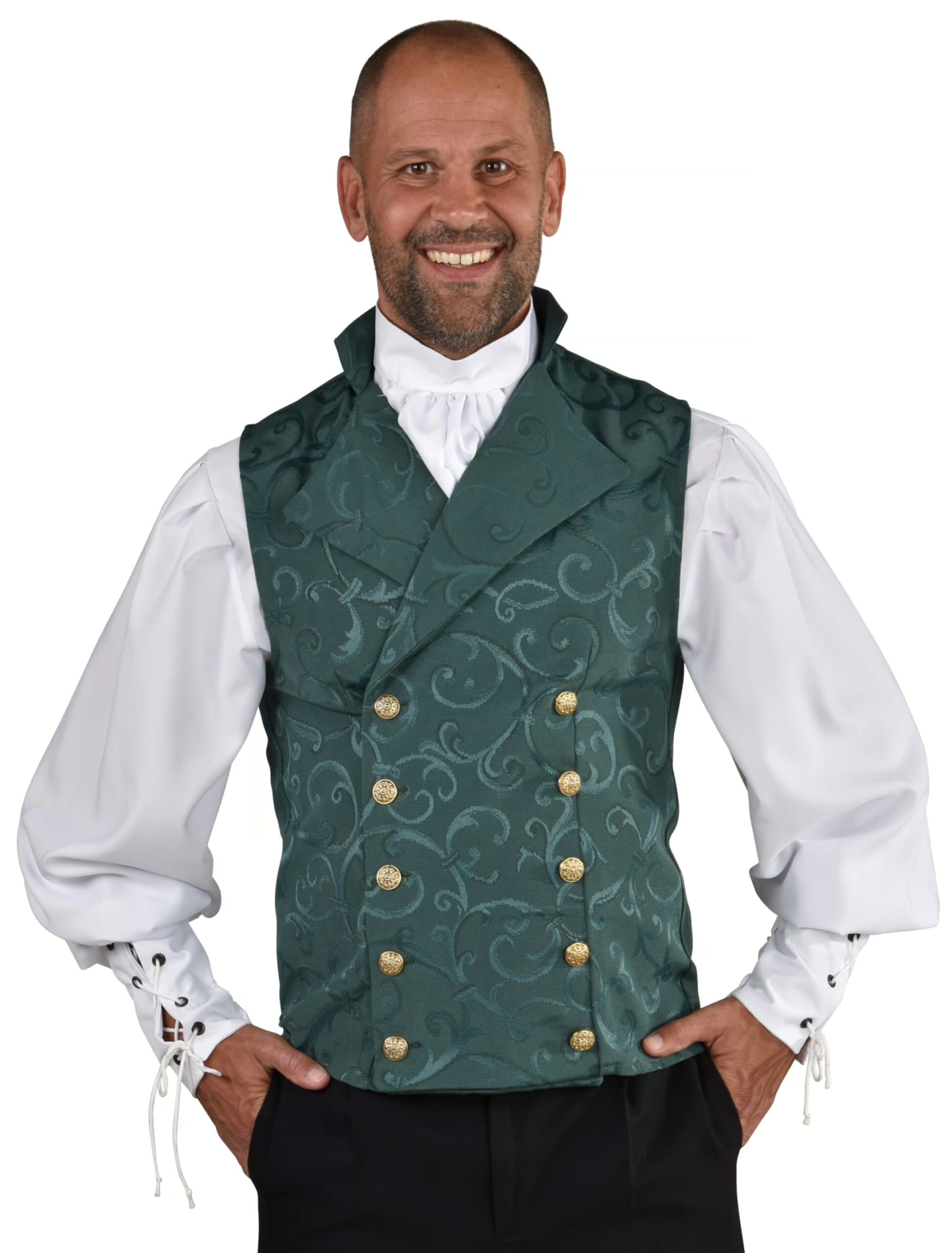 In einem wunderschönen Tannengrün ist diese gotische Weste mit verspielten Ornamenten und extravaganten Knöpfen ein echter Hingucker! Die parallel verlaufende Knopfleiste zaubert Dir eine gute Figur und eine schöne Haltung. Damit wirst Du zum Hit auf jedem mittelalterlichen Kostümball oder anderen Festivitäten. Die Weste ist in verschiedenen Größen und in verschiedenen Farben erhältlich. Schaue dazu einfach in unserem Shop vorbei. Dort findest Du auch weiteres gotisches Zubehör wie zum Beispiel Hemden im Gothic Look.
