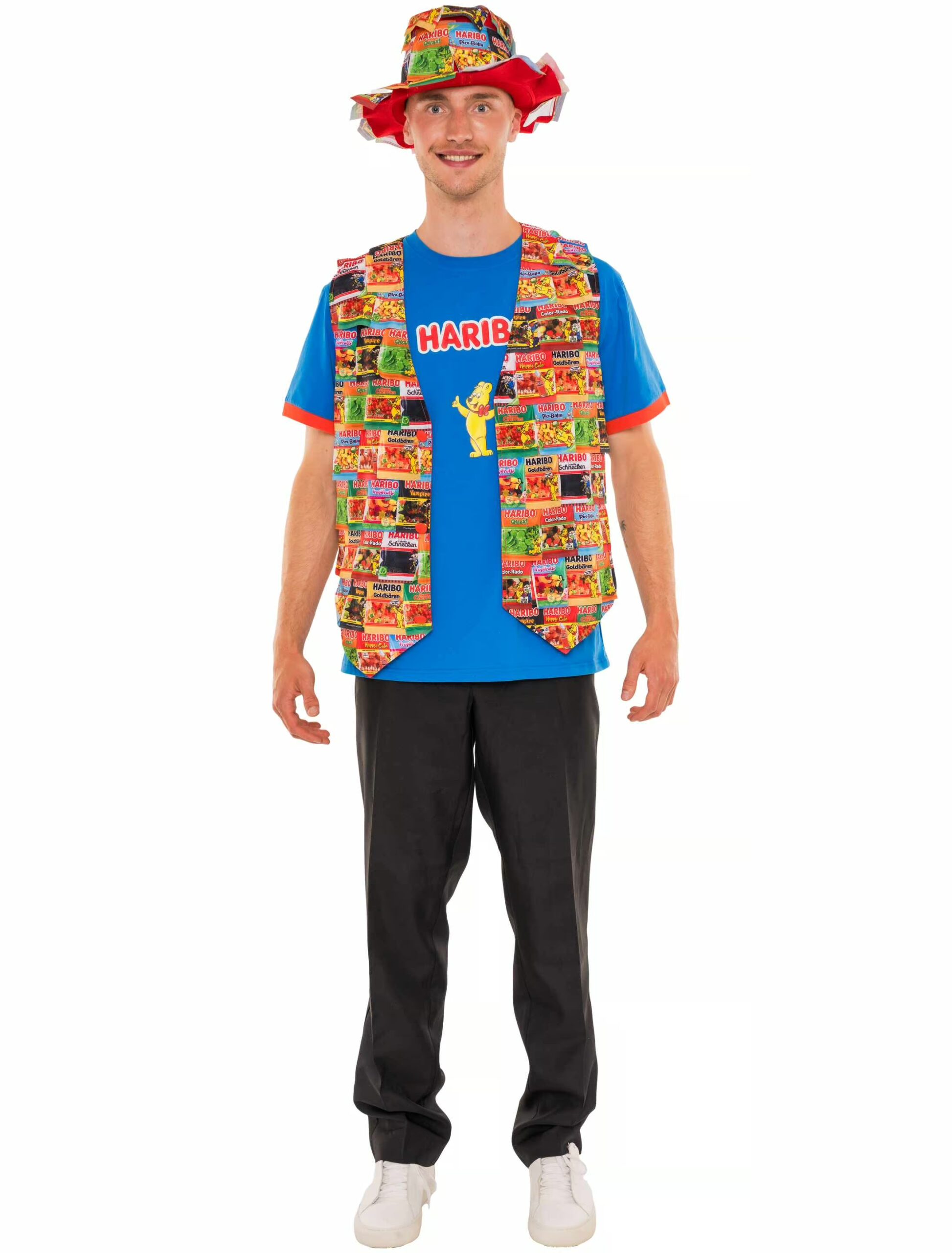 Du bist ein echter HARIBO-Liebhaber und willst das auch allen zeigen? Dann ist unsere Herren Weste aus HARIBO Tütchen genau das Richtige für dich! Ein echtes Statement – und die beste Möglichkeit, deine Süßigkeitenliebe direkt auf deiner Brust zu tragen. Die Weste besteht aus einer Sammlung bunter HARIBO-Tütchen, die garantiert alle Blicke auf sich ziehen werden. Du wirst nicht nur als trendiger Naschkatze unterwegs sein, sondern auch als wandelnde Zuckertüte, die für gute Laune sorgt. Perfekt für Partys, Festivals oder einfach, wenn du mal wieder Lust auf eine süße Überraschung hast. Süß, frech und absolut unwiderstehlich – mit dieser Weste wirst du zum absoluten HARIBO-Hit!