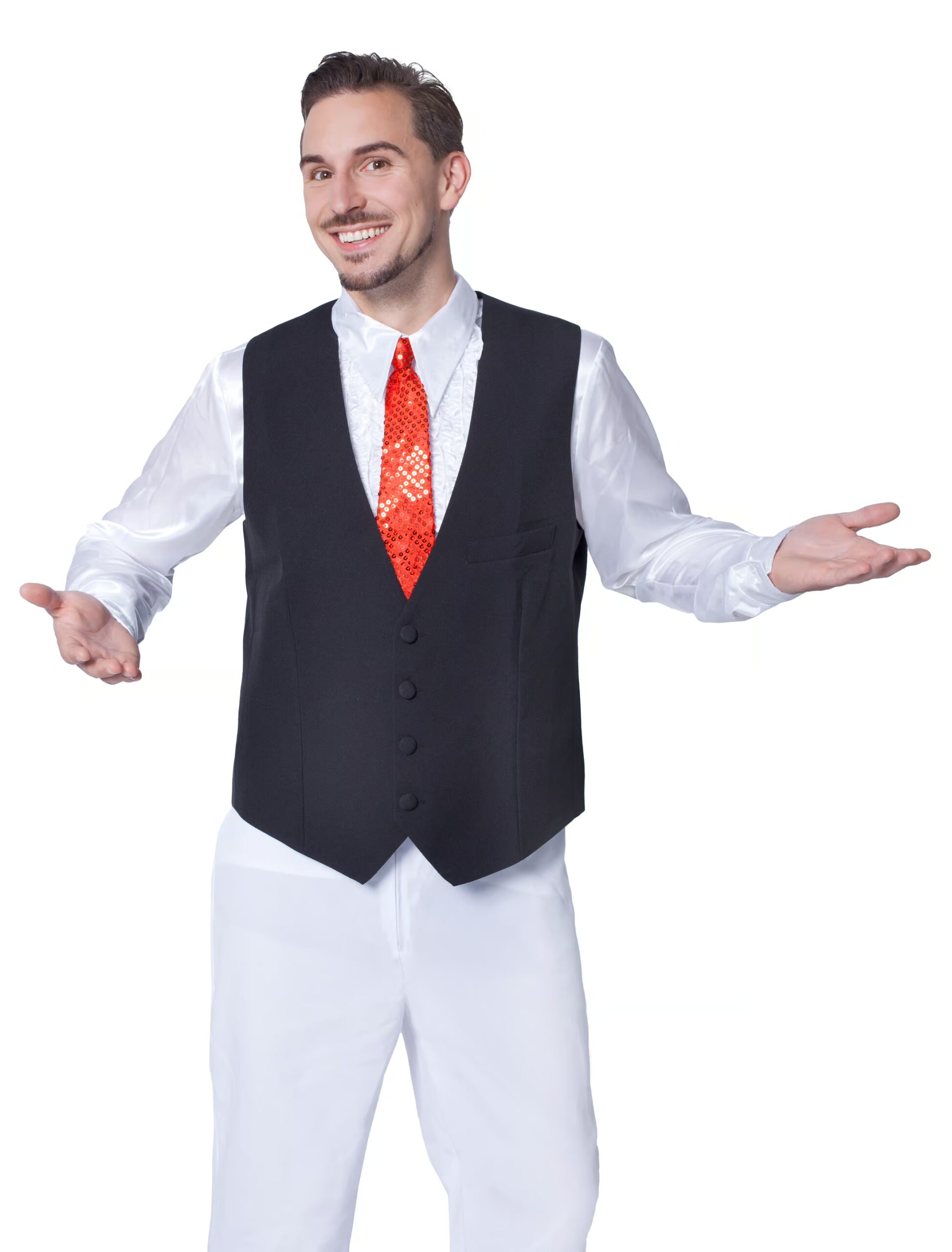 Kleider machen Leute. Das Sprichwort gilt selbstverständlich auch für die Herren unter uns. Ob jung oder alt, eine schicke schwarze Weste über dem weißen Hemd, dazu ein Sakko und Deine Verkleidung zum Geheimagenten oder Gentleman ist absolut gelungen. Mit der schwarzen Weste, die sich mit vier Knöpfen verschließen lässt, wirst Du auf jeder Faschings-, Karnevals- oder Geburtstagsveranstaltung zum absoluten Hingucker. Sie ist für alle diejenigen ein absolutes Muss, die auch bei Verkleidungen wert auf einen gepflegt-seriösen Stil legt. Ein echter Klassiker unter den Verkleidungen.