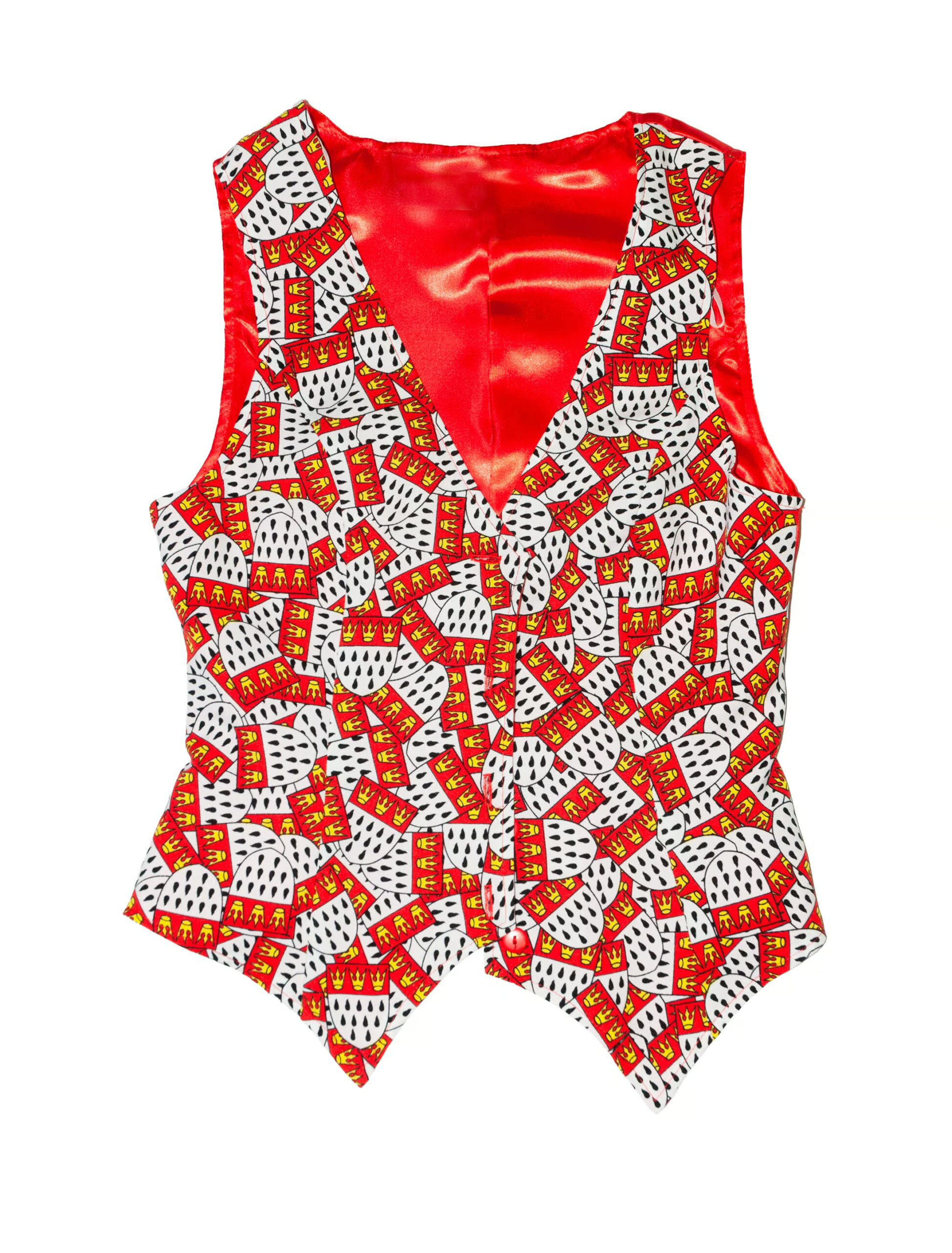 Du bist auf der Suche nach einem passenden Kostümteil für Dein kölsches Outfit? Unsere Damen Weste Köln darf hier nicht fehlen. In der Front ist die Weste mit Knöpfen zu verschließen und ist mit vielen Köln Wappen verziert. Am Rücken kann die Größe noch mit einer Schnalle etwas verstellt werden und ist aus einem roten Satin-Stoff gefertigt. Ein echtes Highlight für Dein Köln-Kostüm! Die Weste ist aus 100% Polyester gefertigt.