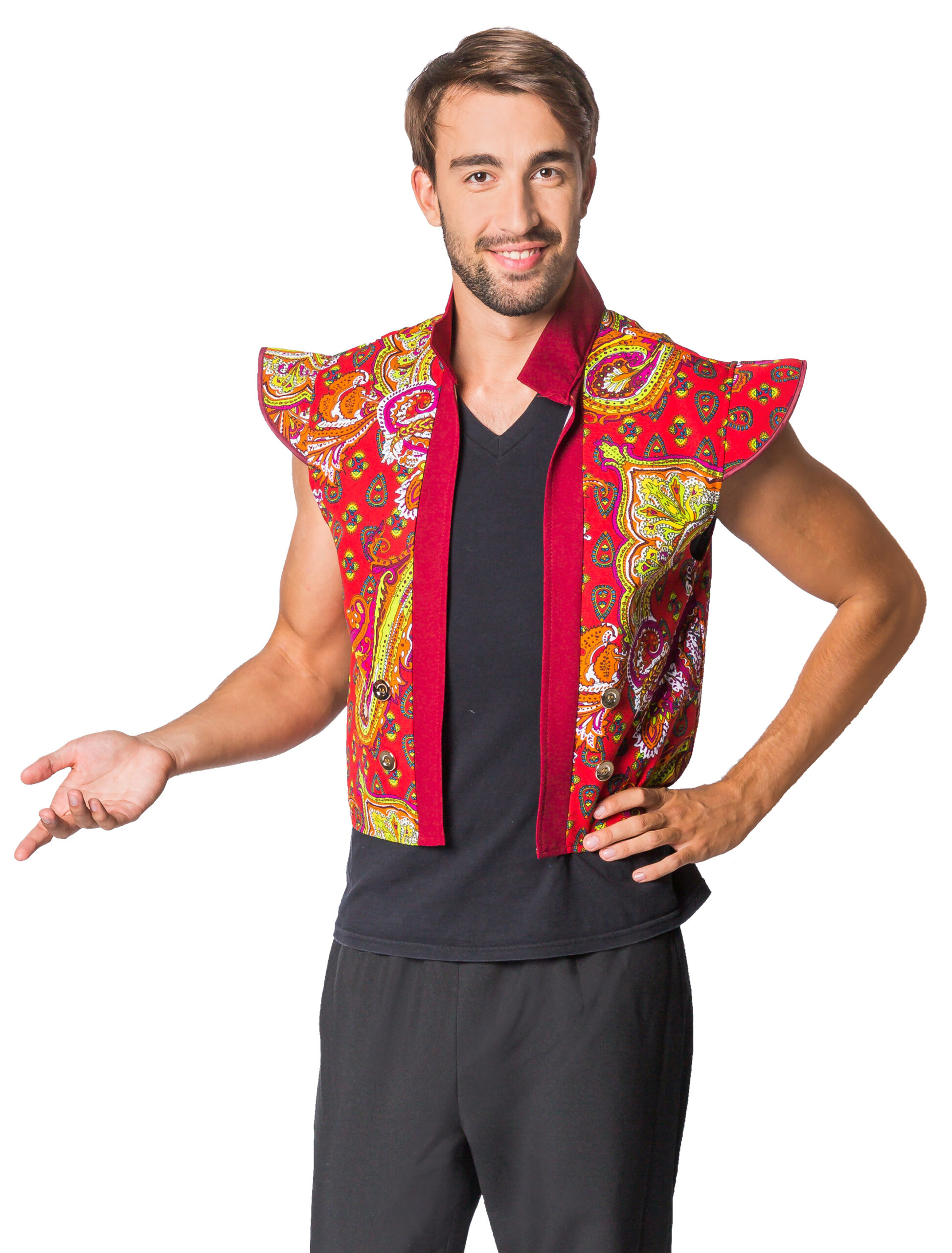 Bunt, wild und so individuell: So eine kunterbunte Weste besitzt sicher niemand auf der kommenden Karnevals- oder Mottoparty! Die hübschen Muster und Ornamente, die ausgestellten Schulterklappen machen diese Weste zu einem ganz individuellen Kleidungsstück für Dein Wahrsager oder Bauchtänzer Kostüm! In Kombination mit Accessoires kreierst Du im Nu Deinen eigenen Look! Exklusiv Artikel.