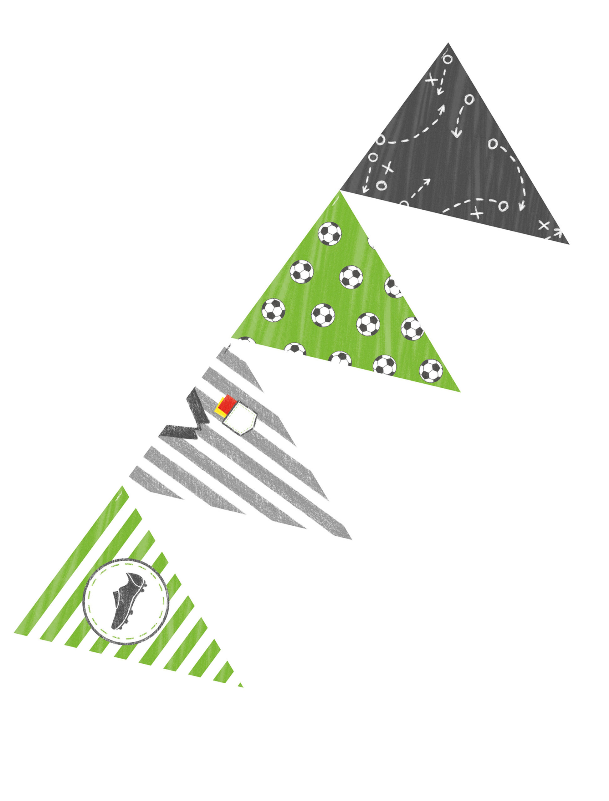 Wimpelkette Fußball Party. Perfekte Deko für das nächste Fußball-Turnier. Die Wimpelkette hat eine Länge von ca. 4 Meter. Die Wimpel haben verschiedene Motive: Schiedsrichter-Trikot, Taktik-Tafel, Fußbälle auf Rasen, Wimpel mit Fußballschuh.